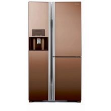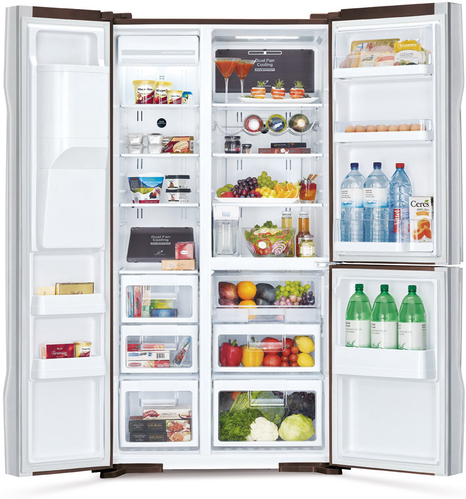 Der Kühlschrank der japanischen Firma Hitachi ist mit drei Kameras ausgestattet, von denen jede eine eigene Tür hat. Im linken Seitenteil befindet sich ein Gefrierfach und rechts befinden sich zwei Kühlfächer. Im oberen Teil befinden sich Regale für Produkte und Seitenfächer, im unteren sind Schubladen für Obst und Gemüse. Das Gerät hat eine Funktion "Kein Frost", was erlaubt, optimale Temperaturbedingungen beizubehalten und nicht Produkte zu unterkühlen. Das Gerät ist mit Eisbereiter ausgestattet und hat einen Kompressor, der es ermöglicht, Energie zu sparen.