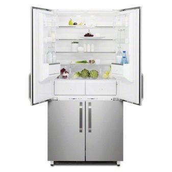 Der zweite Typ ist eine riesige Einheit, die in zwei Teile unterteilt ist: obere und untere. Diese Art von Syde an der Seite wird europäisch genannt. Das obere Fach ist größer und hat einen Kühlschrank. Es hat zwei Flügeltüren und bietet Platz für eine große Anzahl von Produkten, Getränken und Fertiggerichten. Das Gefrierfach befindet sich im unteren Fach, es kann eine Tür haben und ist ein großes, breites Ausrollregal mit mehreren Fächern im Inneren. Es gibt Modelle mit einem Gefrierschrank, der wie der obere Teil zwei Flügeltüren hat.In der Regel ist das europäische Modell etwas kleiner als das gewöhnliche, aber es ist auch geräumig und funktional.