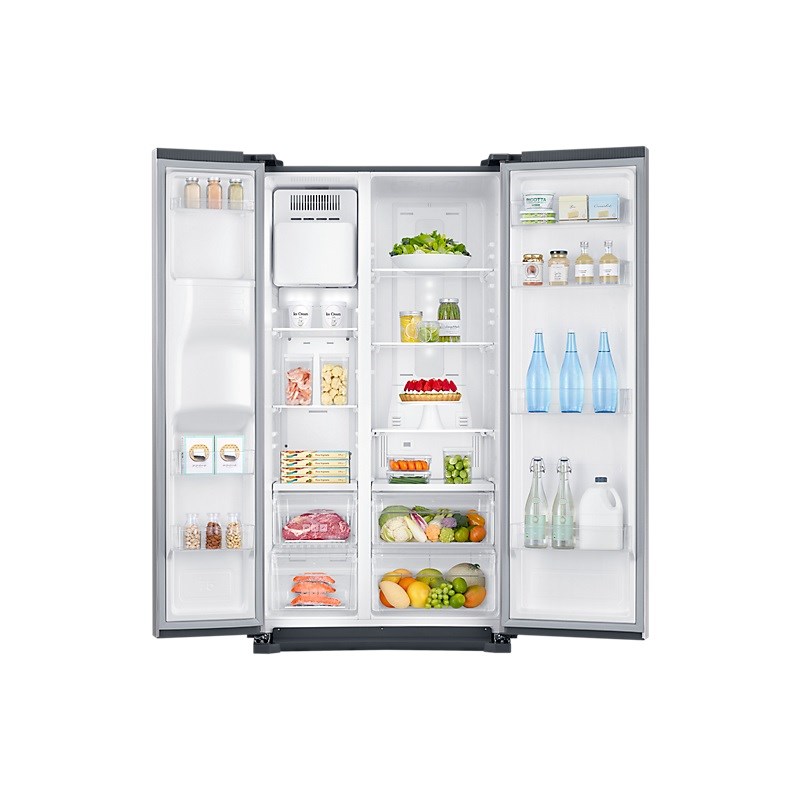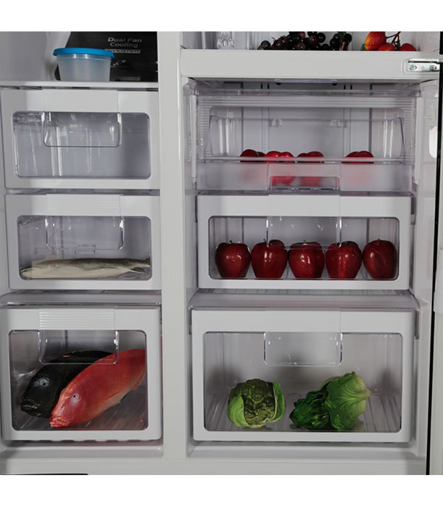 Diese Einheit ist ein europäischer Stil Seite an Seite. Das Gefrierfach befindet sich an der Unterseite und das Kühlfach befindet sich oben, und jedes Fach hat zwei praktische Türen. Der obere Teil hat drei große, geräumige Regale für Produkte und zwei Schubladen für Gemüse und Obst, jede Tür hat mehrere Regale für kleine Gegenstände und Flaschen. Dieses Modell ist mit einem Eiswürfelbereiter mit einem dreistufigen Filter ausgestattet, der es Ihnen ermöglicht, Wasser in höchster Reinheit zu reinigen und die nützlichste und schmackhafteste Flüssigkeit zu erhalten.Der Kühlschrank bewahrt perfekt die Frische der Produkte und verbraucht viel Energie, da er mit einem speziellen Kompressor ausgestattet ist, der Strom spart.