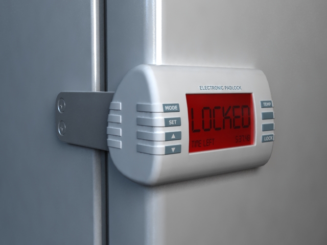 Bei einem solchen Schloss wird ein Timer eingestellt, währenddessen das Gerät den Zugang zu Speisen einschränkt. Zum Beispiel können Sie die Schließzeit von 19.00 bis 6.00 Uhr eingeben. Wenn jemand während dieser Zeit die Kühlschranktür öffnet, ertönt ein lauter Alarm. Ich möchte den Haushalt nicht aufwecken - den Kühlschrank nicht öffnen.