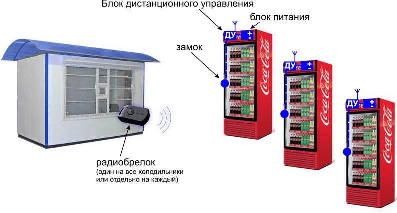 In Geschäften und Einzelhandelsgeschäften ist es bequem, Schlösser zu verwenden, die ferngesteuert werden können. Dies spart Zeit bei der Implementierung, muss nicht im Laden herumlaufen, um die Waren freizugeben. Solche Vorrichtungen sind im Inneren des Kühlschranks installiert und nicht außerhalb. Die Fernbedienung wird in einer Entfernung von ca. 50-70 Metern ausgelöst. Dies ist eines der wenigen Schlösser, die keine Löcher im Kühlschrank benötigen. Dadurch wird das Risiko von Rost und einer Verletzung der Isolierschicht beseitigt.