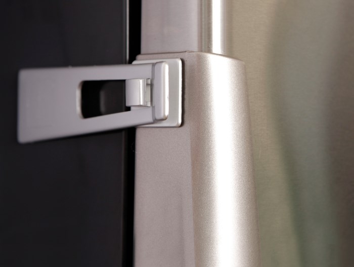 - Eine zuverlässigere und langlebigere Option ist die magnetische Verriegelung. Es ist am Kühlschrank mit Magneten montiert, die sich auf beiden Seiten befinden.
