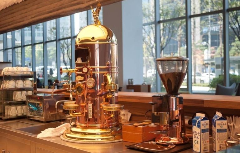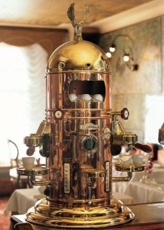 Dieses Modell hat eine goldene Farbe und fällt sofort ins Auge. Solch ein Gerät wird ein Café oder Café schmücken.Die technischen Eigenschaften (Kesselvolumen, Abmessungen, Gewicht, Leistung) sind Maxi ähnlich. Von den Eigenschaften: