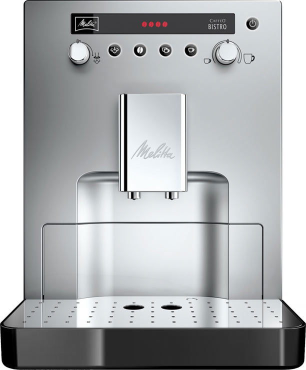 - "Caffeo Bistro Silber". Management-freundliche Maschine mit einem funktionellen Display und den notwendigen Navigationstasten. Ausgestattet mit einem automatischen Reinigungs- und Entkalkungssystem.