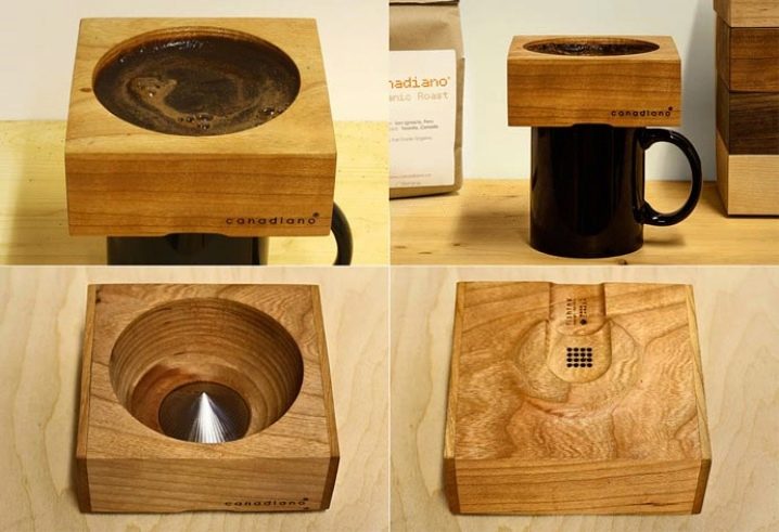 Die Basis des Geräts besteht aus natürlichem Holz, in dem gemahlener Kaffee gegossen wird. Der Inhalt muss mit heißem Wasser gefüllt werden, wonach das Getränk trinkfertig ist.Besonderes Augenmerk sollte darauf gelegt werden, dass die Basis des Gerätes ein spezieller Metallfilter ist, durch den Kaffee austritt.