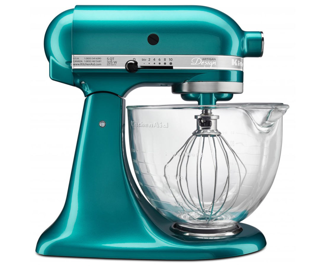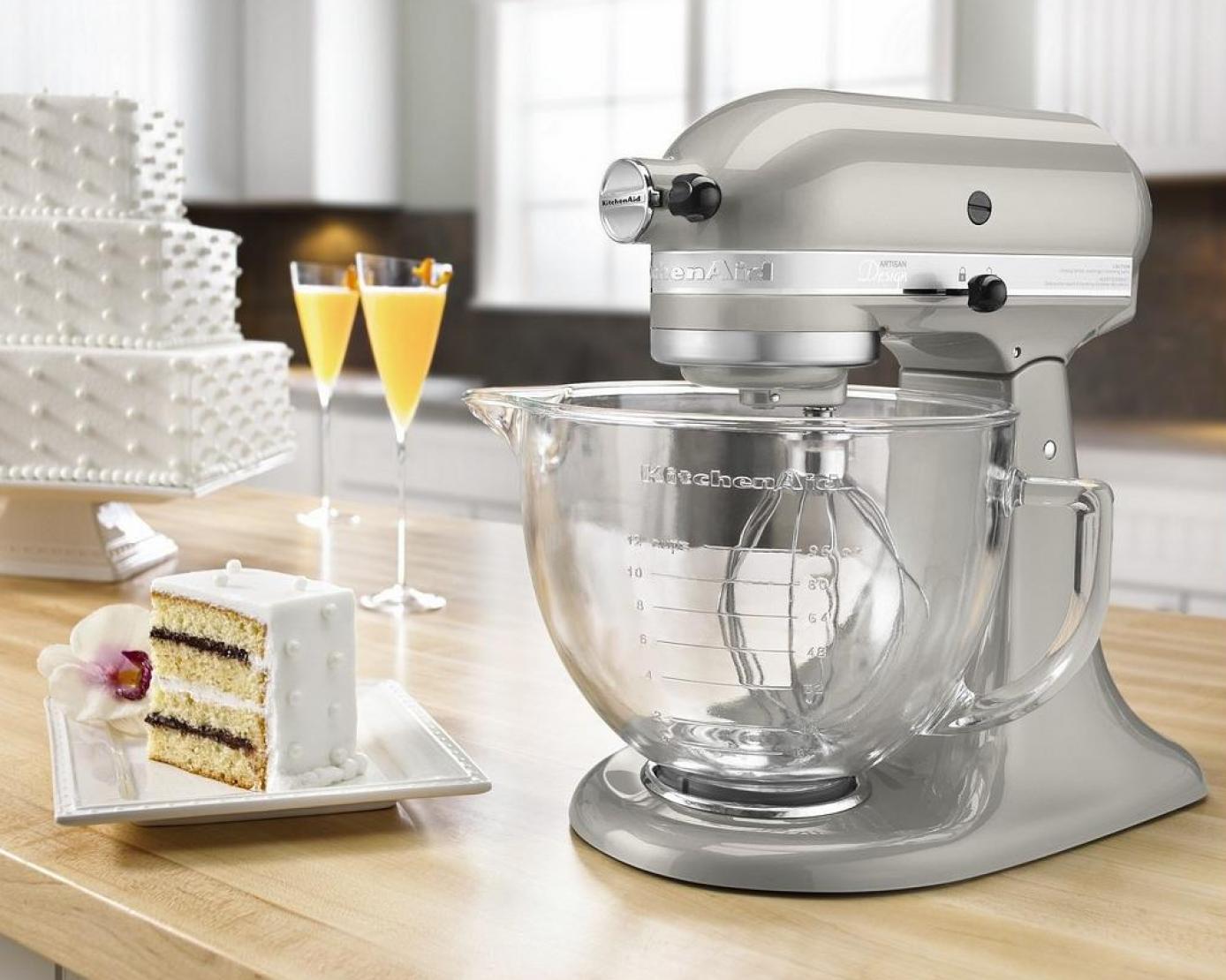 Modell KitchenAid Artisan 5KSM175PSE, anders als der Klassiker, hat ein erweitertes komplettes Set. Zusätzlich zu den zusätzlichen drei Düsen enthält das Kit auch ein Paddel mit einer Silikonrippe zum Arbeiten mit dickflüssigen Produkten. Ein Drei-Liter-Mini-Schüssel und Felge sind in der Standard-Schüssel enthalten, um Spritzwasser zu vermeiden. Zu einem Mixer mit einem 4,8-Liter-Becken können Sie eine separate Glasschale kaufen, mit der Sie den Arbeitsprozess effizient verfolgen, Lebensmittel im Kühlschrank aufbewahren und in der Mikrowelle aufwärmen können.