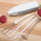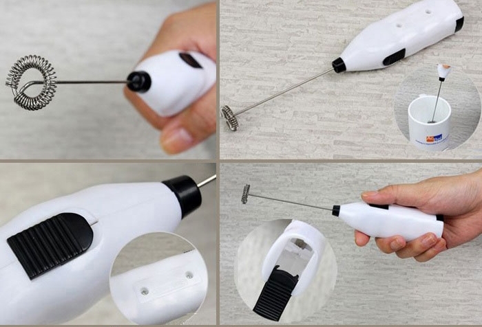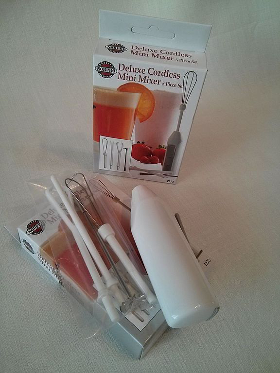 Mixer Deluxe Akku-Mini-Mixer Ich habe eine Menge positives Feedback erhalten. Er verprügelt perfekt die Milch und die Sahne, und ein Kunde gab an, dass sich der Metallteil in zwei Monaten nicht verschlechtert hatte und seine Farbe nicht verändert hatte.