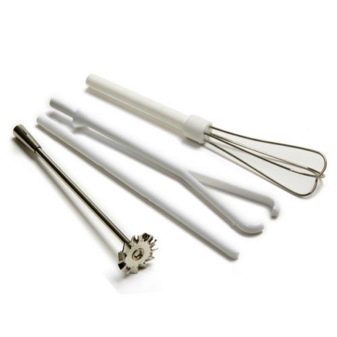 Es gibt sowohl einen herkömmlichen Schneebesen als auch eine spezielle Düse für den Teig sowie andere Düsen, die es ermöglichen, komplexere Mischungen herzustellen, mit denen eine Art von Düse nicht zurecht kommt.