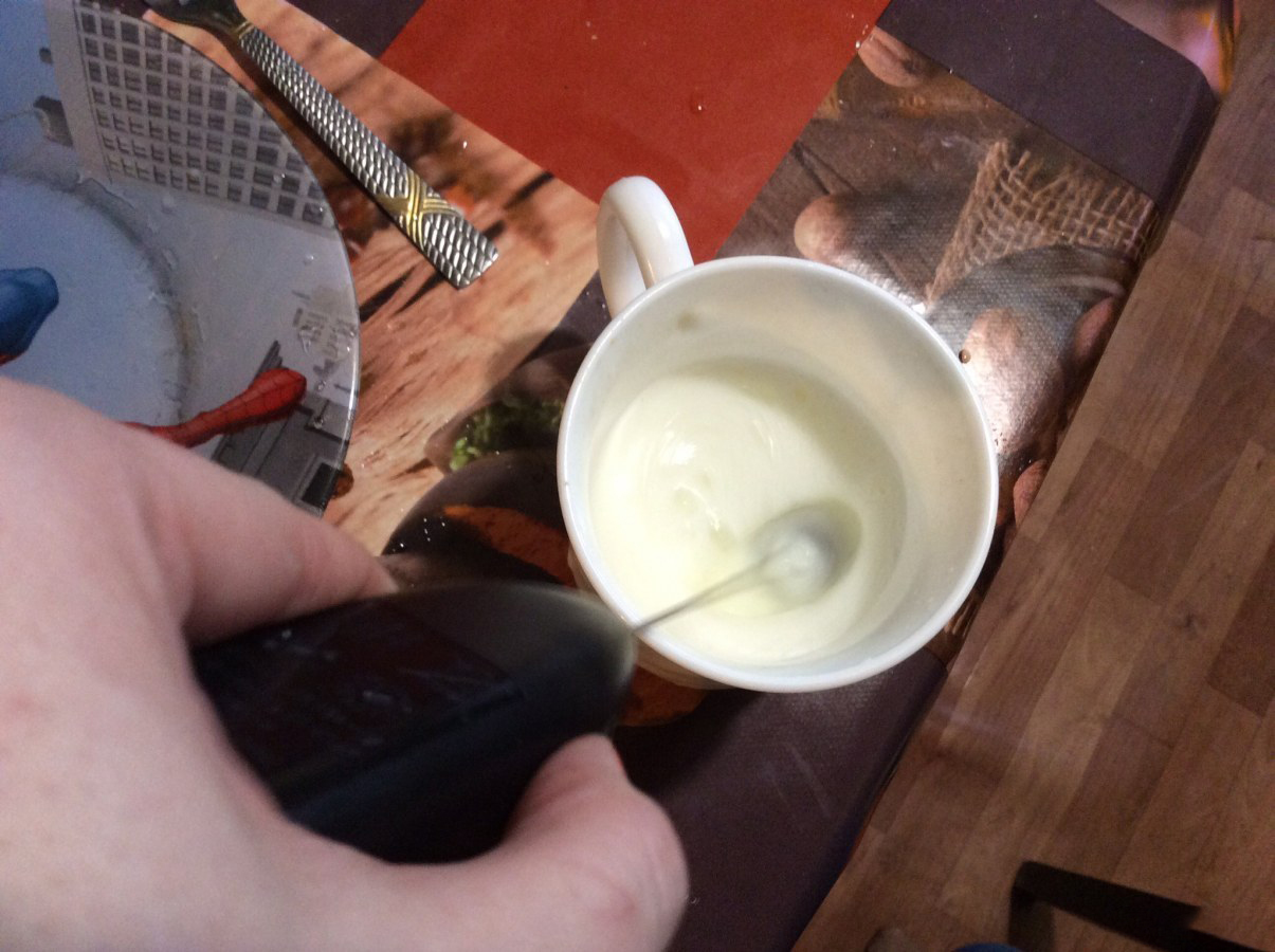 Beat die Milch ist, beginnend von unten und allmählich aufsteigend, nicht weniger als dreißig Sekunden. Da die Aufwärtsbewegung es wert ist, vorsichtig zu sein, können Sie den Tisch leicht spritzen.