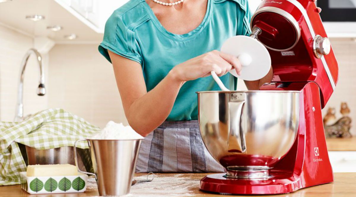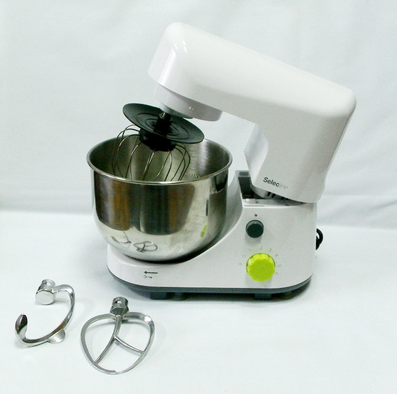 Ein einfacher preiswerter und stilvoller Mischer mit einer großen Metallschüssel. Sein Volumen beträgt 4 Liter. Bietet 5 Geschwindigkeiten und Turbo-Funktion, ausgestattet mit Blumenkronen und Haken. Leistungsmodell 300 Watt. Ziemlich schwach, wenn Sie gerne Kekse machen.