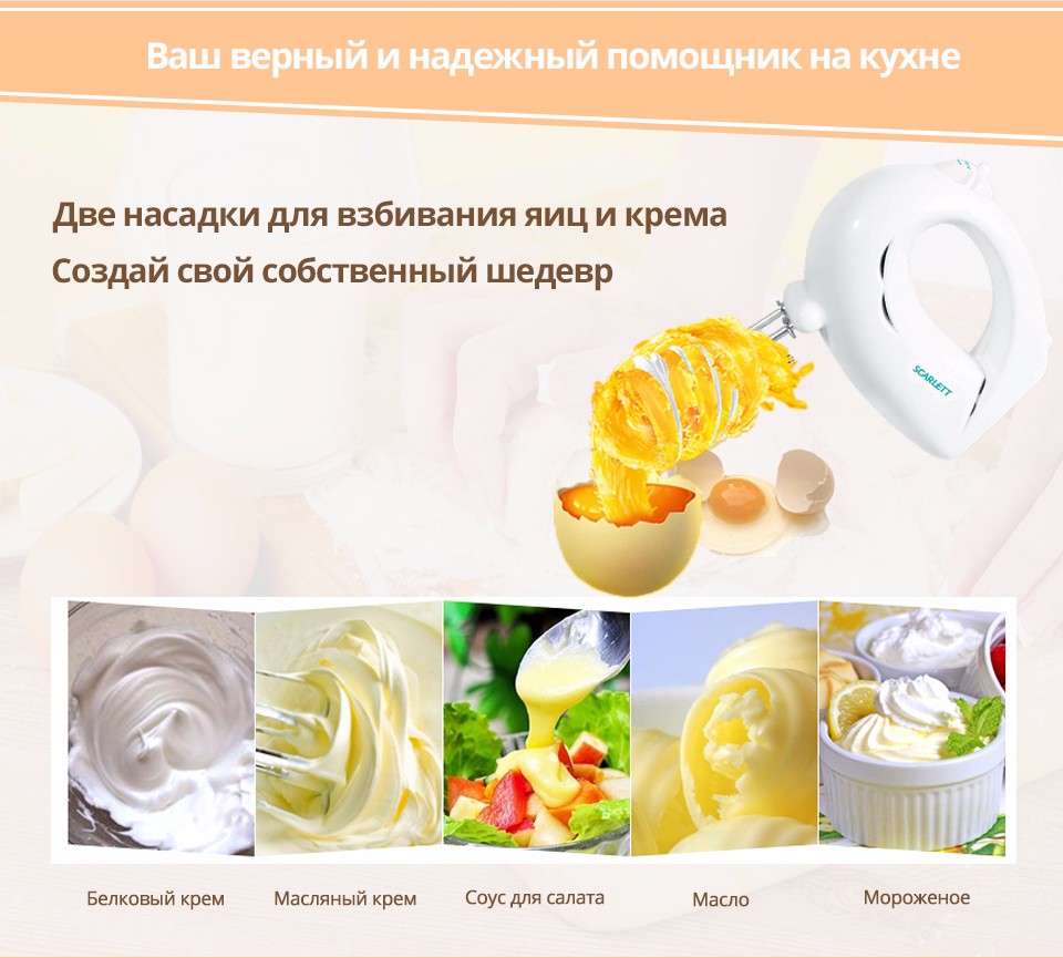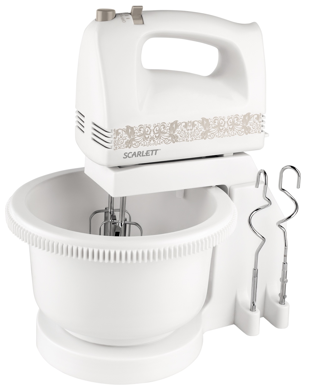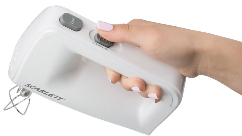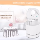 - SC-HM40S07 Der Mixer hat eine Leistung von 550 W und vier Düsen von zwei für Cremes und Teig. Der bequeme Griff, der nicht in die Hand gleitet und die genaue Umschaltung der Geschwindigkeit der Arbeit, verwenden Sie das Gerät einfach und bequem.