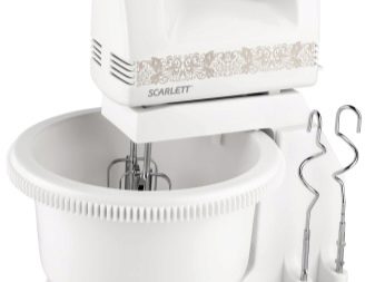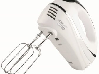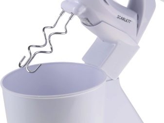 Alle von Scarlett hergestellten Mischer sind in manuell und stationär unterteilt. Im ersten Fall haben sie eine kompaktere Größe und geringere Leistung. Die Schlagschüssel ist nicht in ihrem Bausatz enthalten, und bei der Arbeit muss ein solcher Mixer in den Händen gehalten werden.Typischerweise haben diese Geräte im Vergleich zu stationären Modellen weniger Leistung, weniger Geschwindigkeiten und Düsen im Kit, aber sie kosten oft eine Größenordnung weniger.
