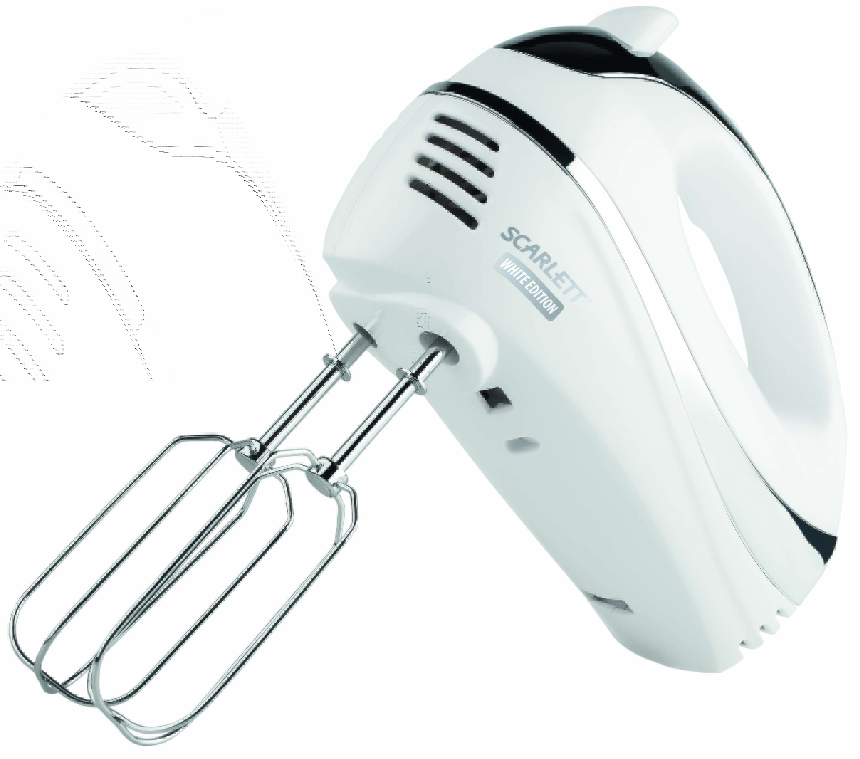 - SC-HM40S01 der Low-Power-Mixer mit zwei Arten von Düsen und fünf Arbeitsgeschwindigkeiten. Ideal zum Aufschlagen von Cremes und Eiern, kann es auch verwendet werden, um Teig zu machen. Es hat einen Turbo-Modus, der die Kochzeit deutlich reduziert.