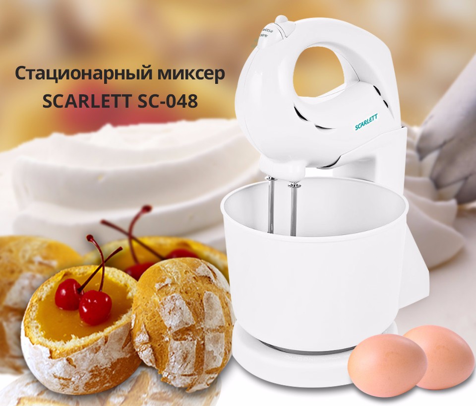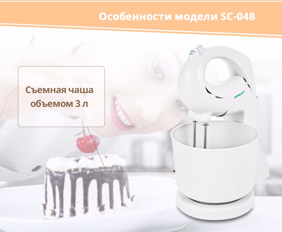 - SC-048. Dies ist ein funktionaler Mixer, auf einem speziellen Ständer. Es hat eine geringe Kapazität und im Betrieb fast keinen Lärm. Der Hersteller hat auf zwei zusätzliche Düsen und fünf Geschwindigkeiten geachtet, wodurch es möglich ist, dieses Gerät für verschiedene Operationen zu verwenden.