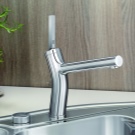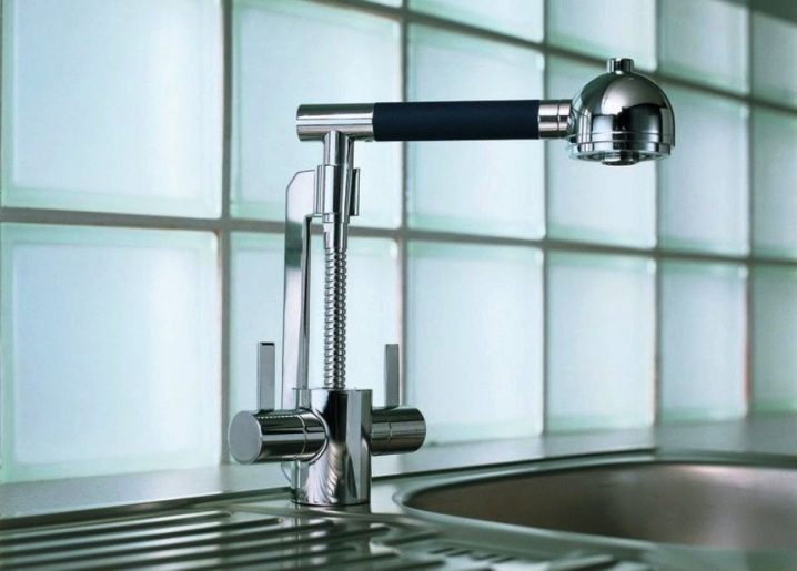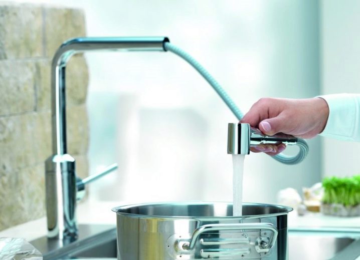 Einziehbarer Wasserhahn, der dem Duschgriff optisch ähnlich ist. Das Prinzip seiner Funktionsweise besteht darin, den Abfluss gegebenenfalls von einem kurzen Abgriff zu verlängern. Die Länge des Schlauches kann von ein bis eineinhalb Meter variieren.