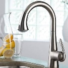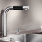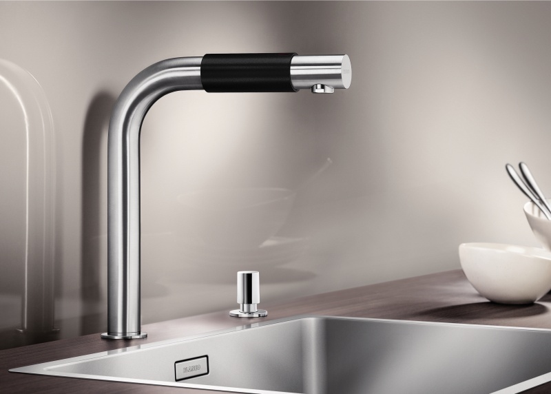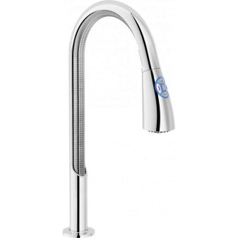 Flexibler und weicher Auslauf gilt als die preisgünstigste Option. Die Länge des Krans kann einfach durch Drücken der Taste geändert werden. Es ist auch ziemlich hochwertig und verschleißfest. Sein Minus ist jedoch eine mittelmäßige Erscheinung. Dieses Design ist nicht für jeden Küchenstil geeignet.