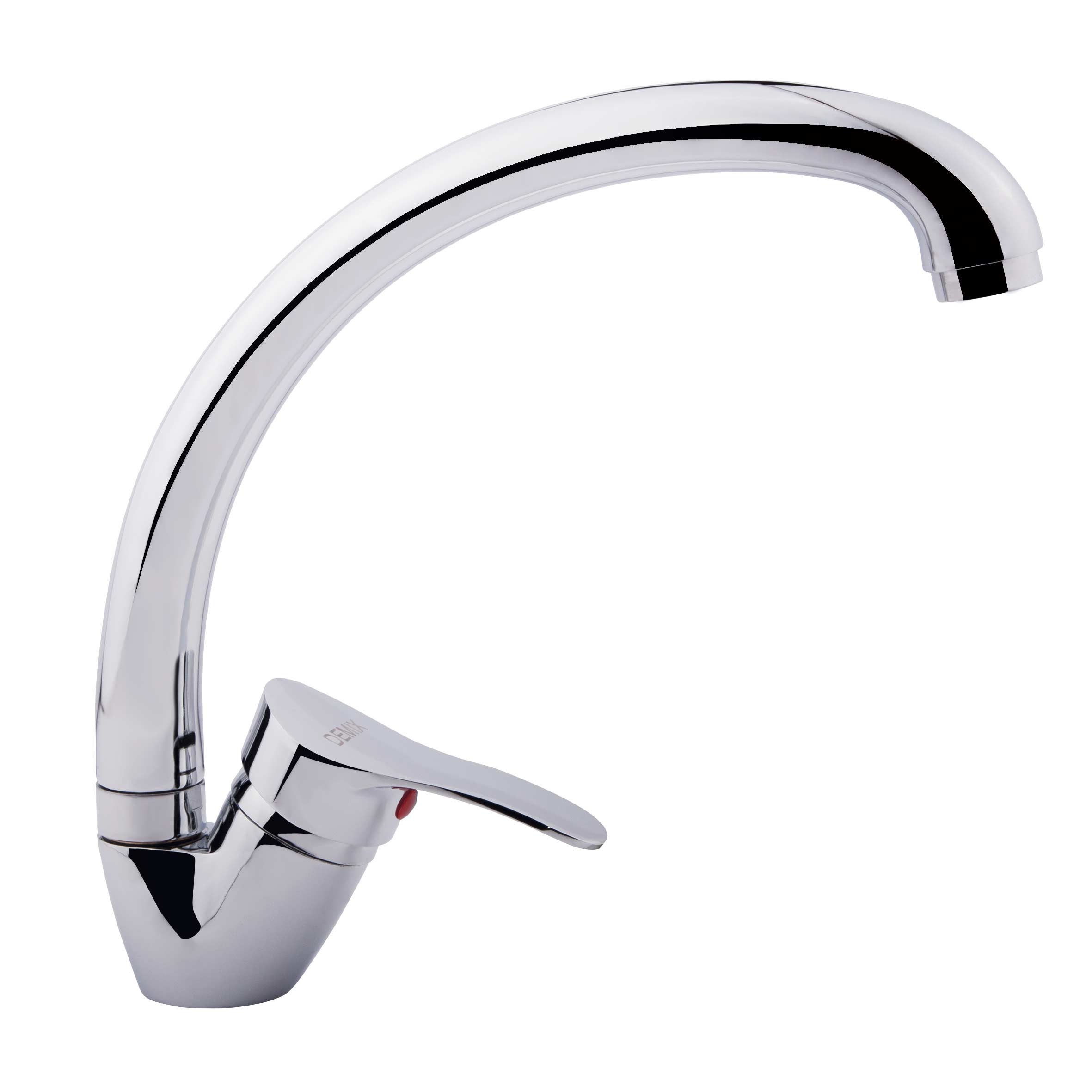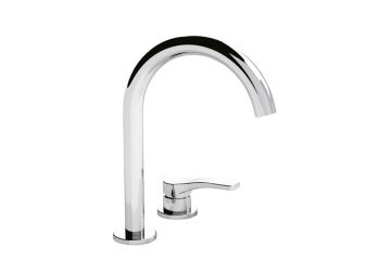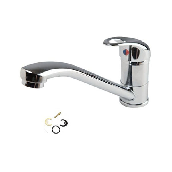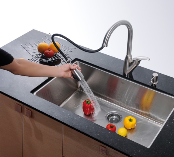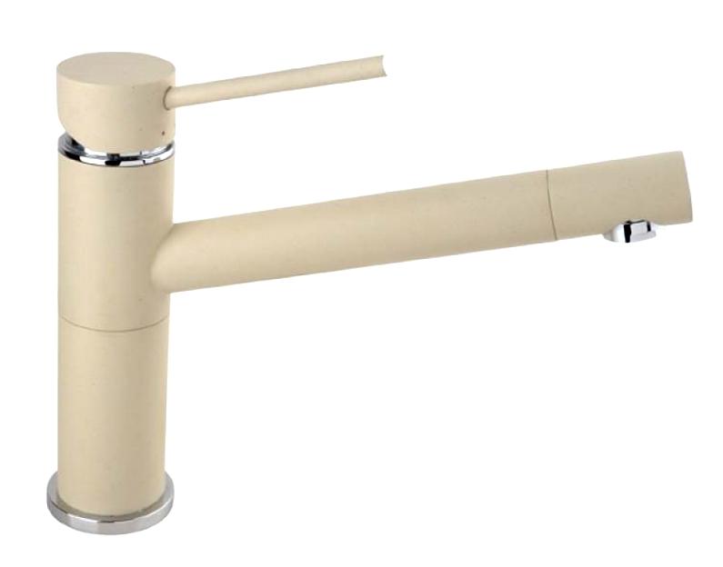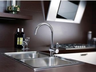 Für eine kleine Spüle ist ein hoher Auslauf nicht erlaubt, weildas mit erhöhtem Kopfspray wird geschaffen. Ein niedriger Auslauf ist jedoch unbequem, da es nicht möglich ist, einen großen Behälter mit Wasser zu füllen.
