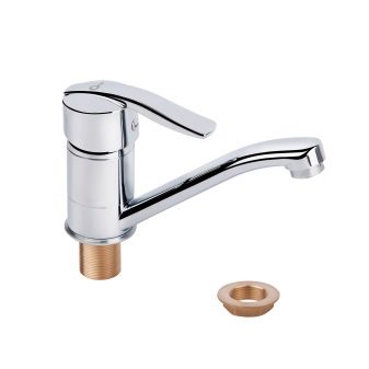 Zum Beispiel werden Tap-Box-Mischer mit einer geteilten Hülse mit Gewinde an der Oberfläche befestigt. Ein Joystick-Wasserhahn hat in seinem Kit eine Unterlegscheibe, eine Mutter und einen Stift, der an der Spüle oder Arbeitsplatte befestigt ist.