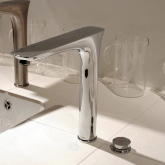 - Einfache Verwaltung, oder vielmehr, seine vollständige Abwesenheit. Sie müssen nur einen Teil des Körpers oder des Objekts zum Wasserhahn bringen und der Infrarotsensor wird sofort funktionieren.