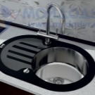 - Spüle mit drei Fächern der runden Form - wird zum vollwertigen Zentrum für die Ausführung der Arbeit in der Küche. Es enthält zwei große Muscheln und eine kleine, in der Mitte. Ein kleines Element wird beispielsweise zum Auftauen von Lebensmitteln verwendet.