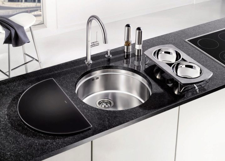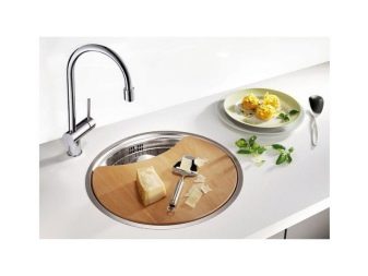 Spüle wird bequemer und praktischer, wenn Sie eine Vielzahl von Zubehör verwenden. Zum Beispiel wird die Verwendung eines runden Schneidbretts den Arbeitsraum vergrößern. Und die Verwendung von Stahlgeräten zum Trocknen von Geschirr ist eine ausgezeichnete Option für ein Waschbecken mit zwei Schalen, man kann die Teller waschen, und die andere, um sie zu trocknen.