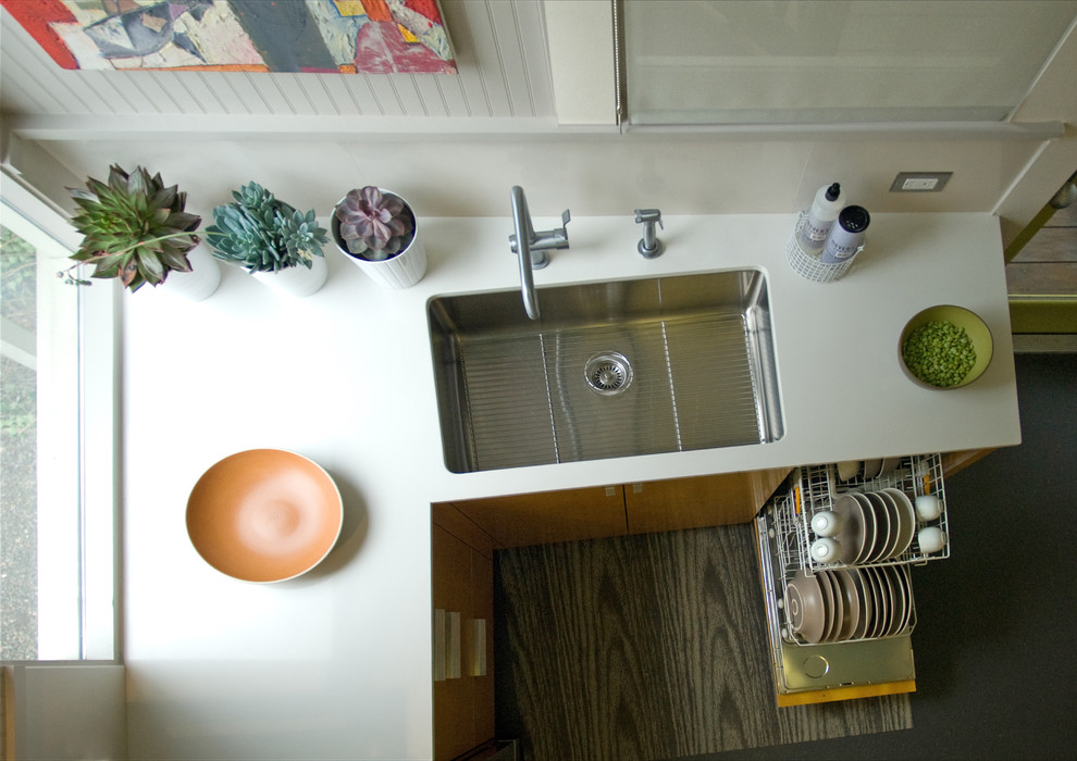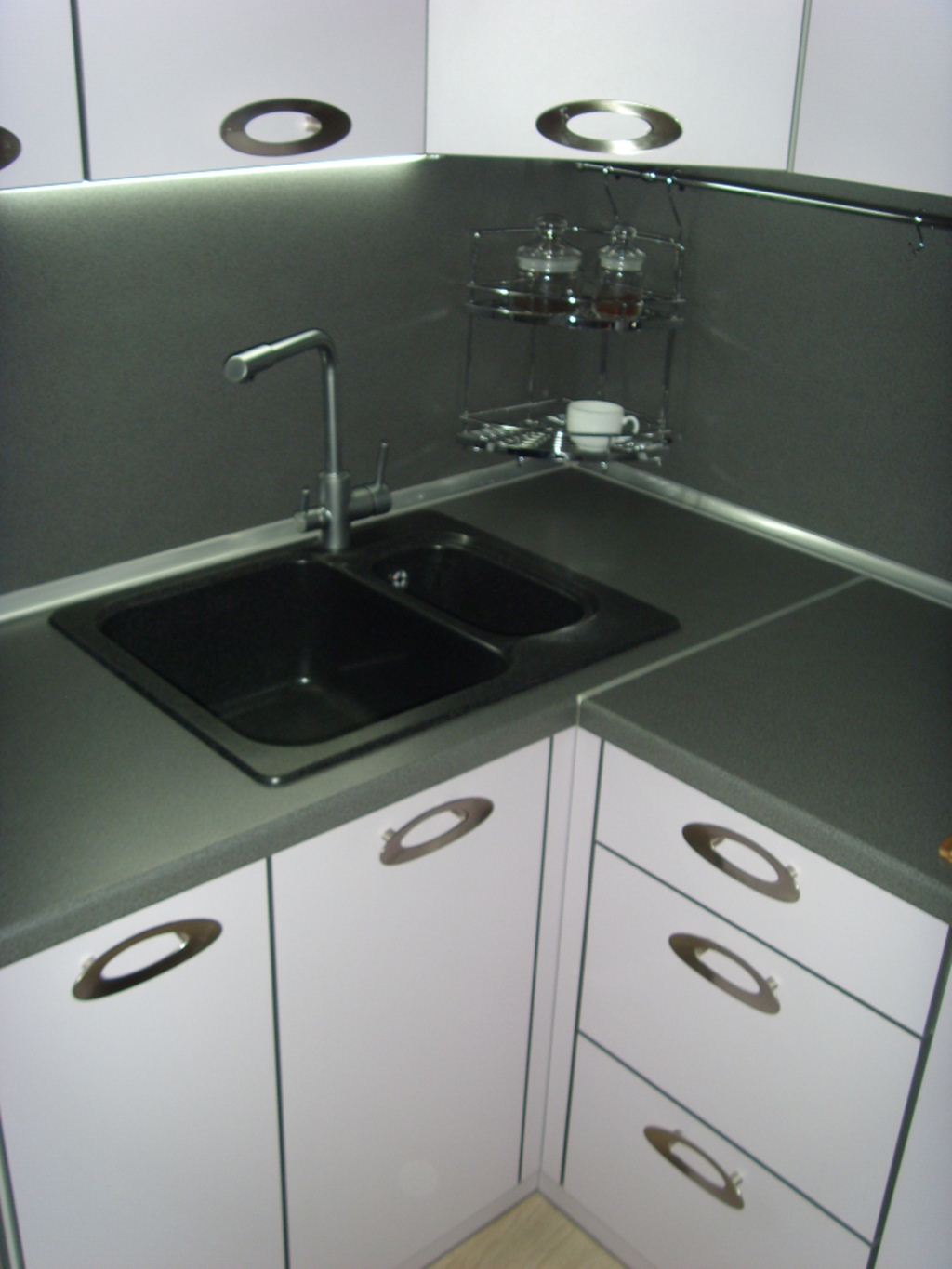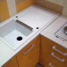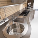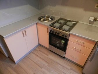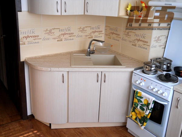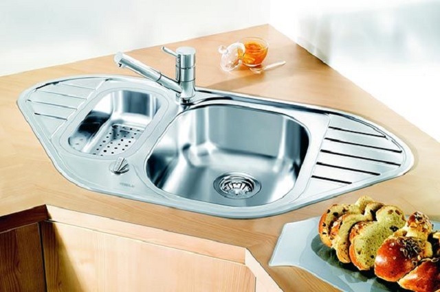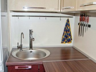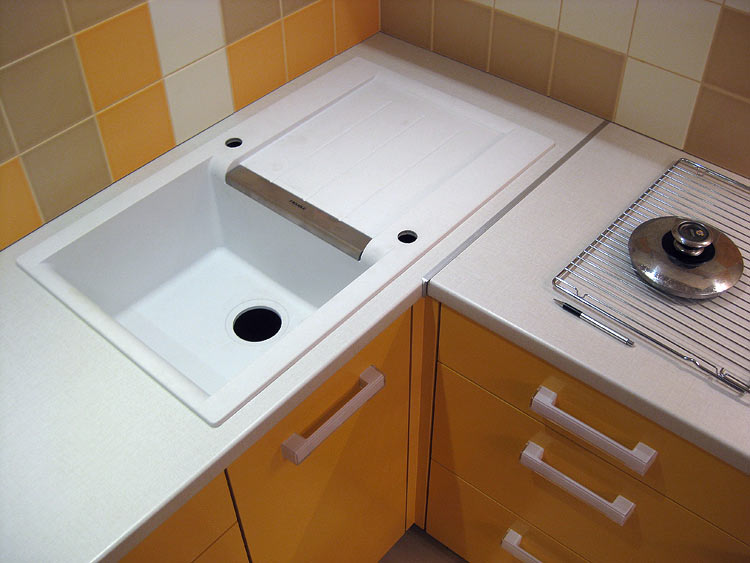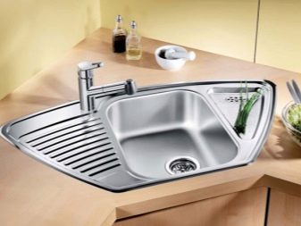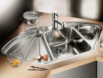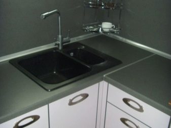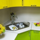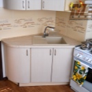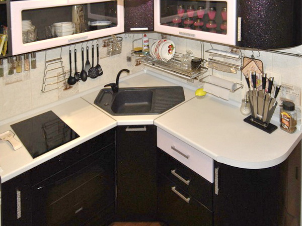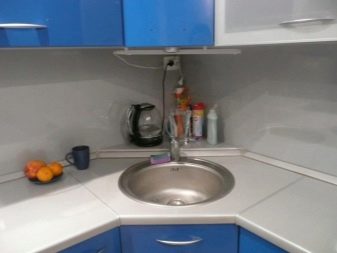 Konstrukteuren wird empfohlen, eine Spülmaschine in kleinen Küchen zu installieren, oder ein kleines Waschbecken in der Ecke zu installieren, nur in diesem Fall kann es notwendig sein, die Kanalisation Rohre zu übertragen. Außerdem passen zwei oder mehr Personen nicht in den Eckenbereich, und Personen mit kleiner Statur werden mit einem solchen Waschbecken nicht sehr zufrieden sein, da der "tote Bereich" für sie unzugänglich wird und Sie die ganze Zeit vorwärts ziehen müssen, wodurch zusätzliche Belastung auf den unteren Rücken entsteht .