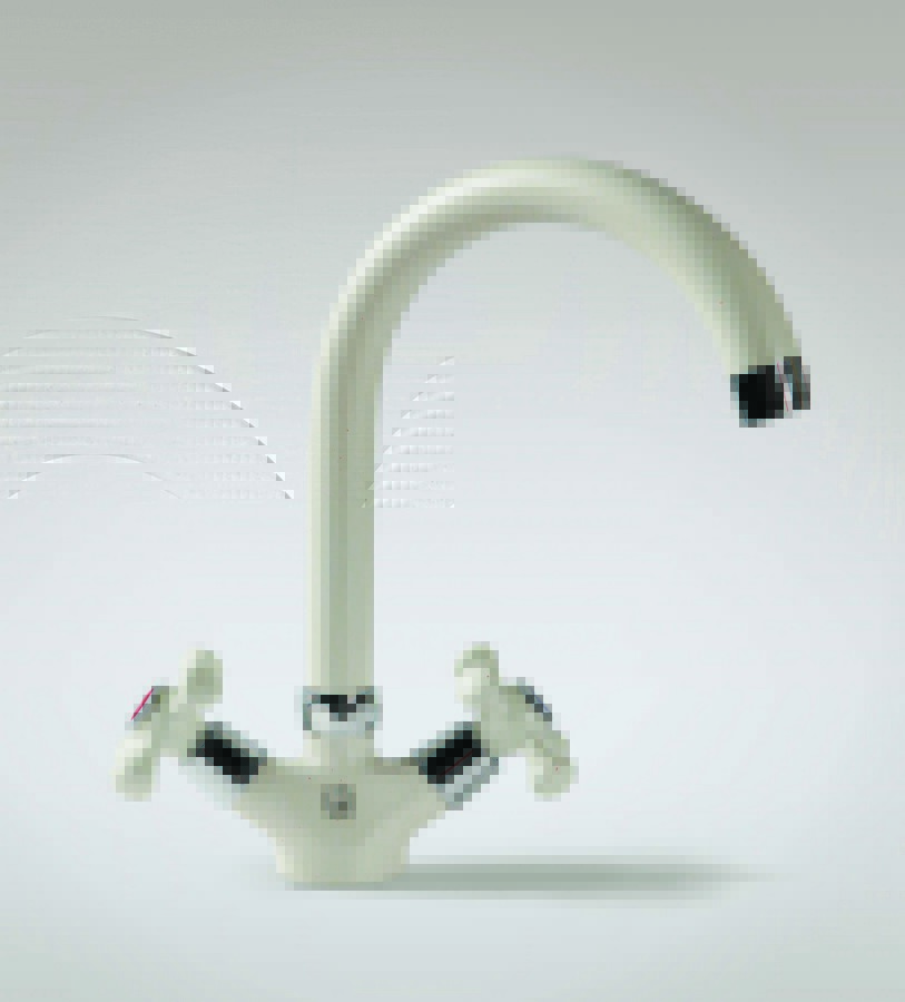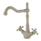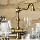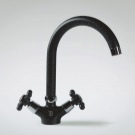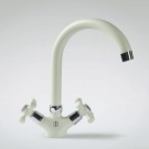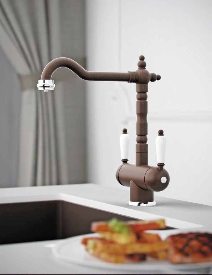 - Klassisch. Normalerweise ist es ein L-förmiger Zweiventilmischer, gehalten in der traditionellen Form. Meistens fällt die Wahl auf weiße und braune Modelle, mit verchromten Details für Retro.