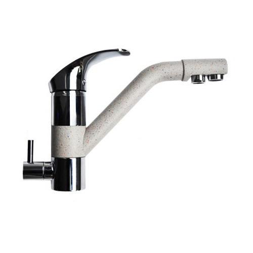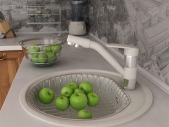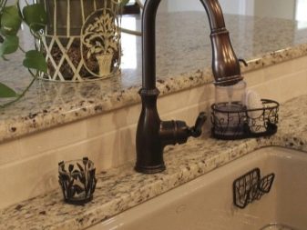Moderne Armaturen mit einer stationären Gießkanne können sich in einem Winkel von 120 bis 360 Grad entfalten, was die Auswahl eines Platzes zum Waschen und Auffinden von Geräten vereinfacht. Einige Modelle sehen aufgrund der Kombination eines Teils der Beschichtung aus Kunststein mit Messing- und Chromelementen ungewöhnlich und interessant aus.