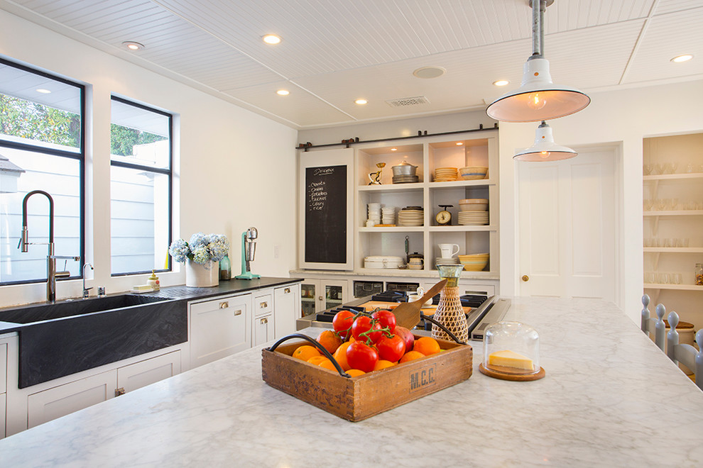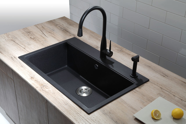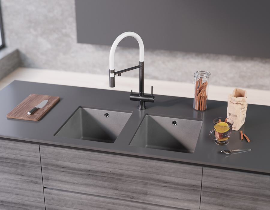 - Hightech Ein supermoderner Mischer, diagonal oder mit variablem Ablauf, ergänzt die Spüle um eine rechteckige oder ungewöhnliche geometrische Form.Das Spiel von Farben und Texturen, der Kontrast von Schwarz, Weiß oder Grau wird den Eindruck eines spektakulären Headsets in der Küche verstärken.