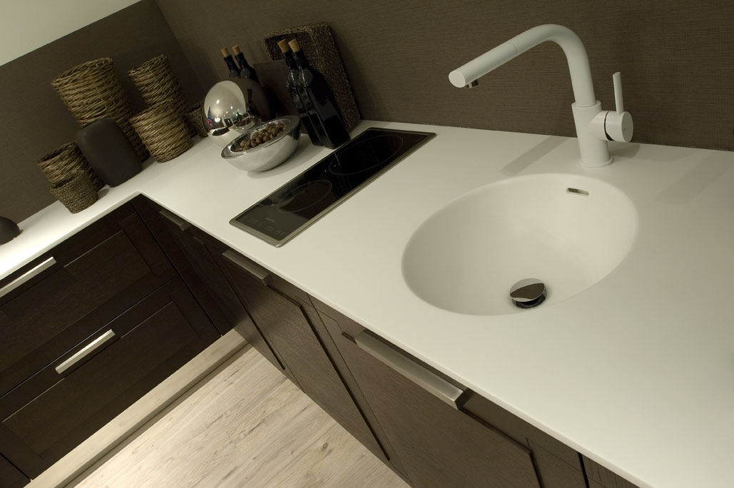 Es gibt keine sehr hellen Töne bei der Farbgebung von Kunststein, aber oft sind Pastell, Grün und Neutral vorhanden - Farben wie Weiß-Grau, Rosa und Beige werden harmonisch mit dem Rest des Inneren einer zarten und leichten Küche kombiniert.
