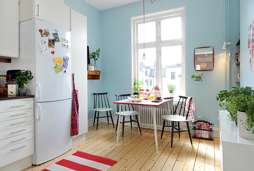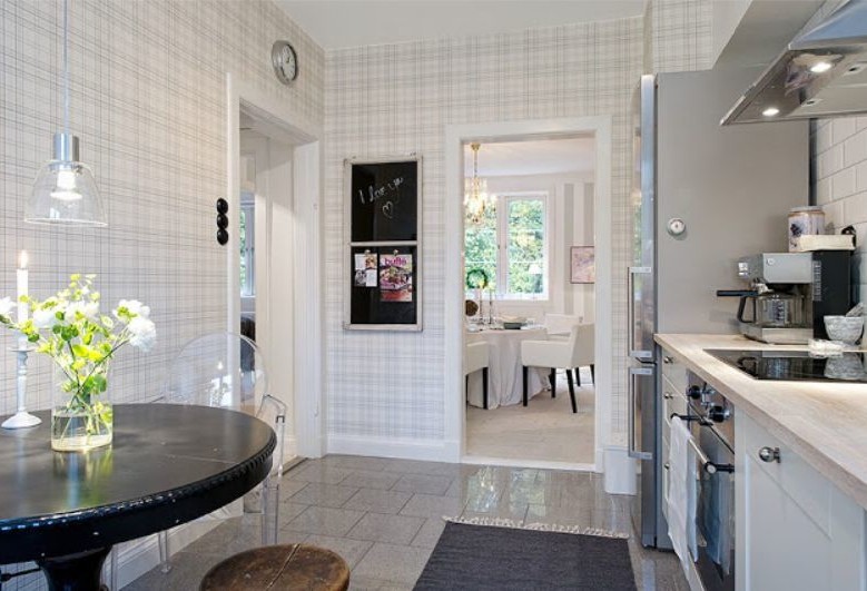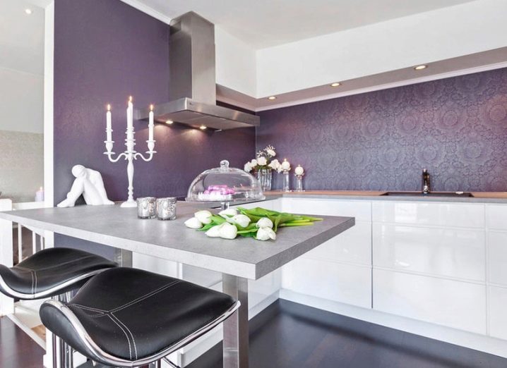 Willst du mehr Platz? Wählen Sie coole Farben: Blau, Blau, Silber. Lieber Gemütlichkeit in der Küche? Fühlen Sie sich frei, Tapete saturated Farben zu haften: dunkelgrau, braun, lila, Burgunder.