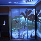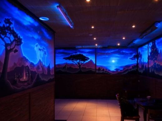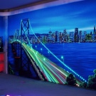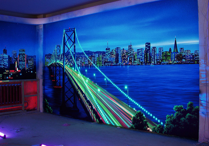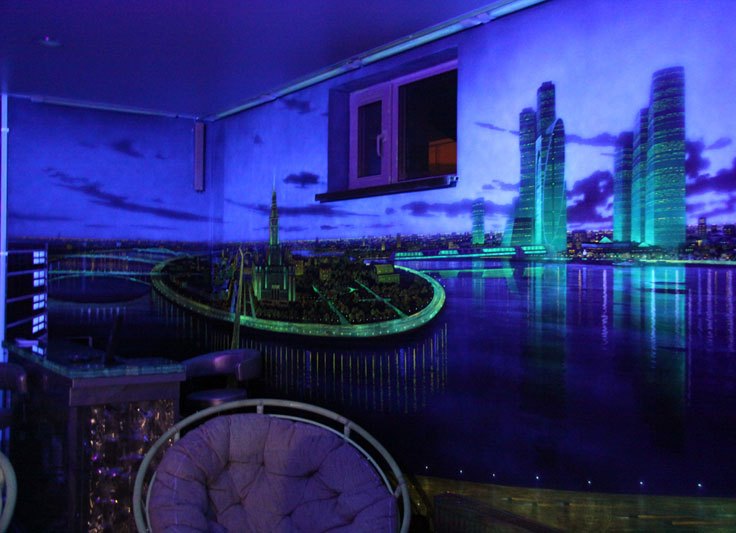 Fototapete fluoreszierende - die beste Küche Option. Am Nachmittag sehen sie aus wie alle voluminösen Tapeten. Aber nachts beginnt das Interessanteste - als ob sich die Türen zu einem Märchen öffnen. Sie können Tee trinken und den Blick auf die Nachtstadt oder den Sternenplatz genießen. Mit ultravioletten Glühbirnen beleuchtet, wird das Bild lebendig, es enthüllt Details, die während des Tages verborgen sind. Das Bild wird mit speziellen Farben auf Vlies aufgetragen.