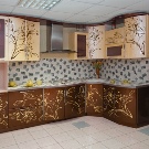 Niedrige Decken in der Küche "korrigieren" vertikale Zeichnungen. Dies wird die Decke optisch höher machen. Dies könnte ein Wald werden, von unten nach oben abgebildet. Oder architektonische Türme, Hochhäuser, die zum Himmel emporheben. Oder einfach nur komplizierte Muster, die nach oben gehen.