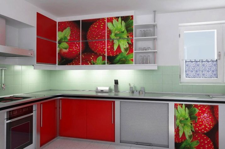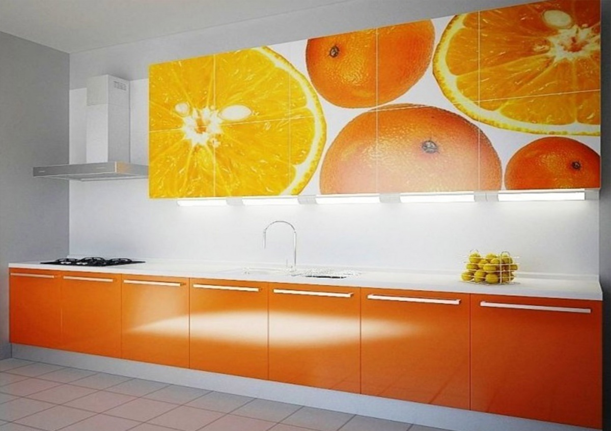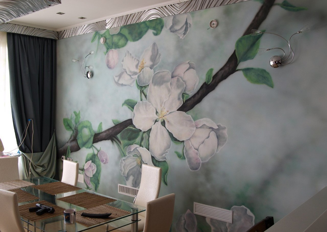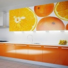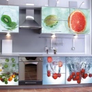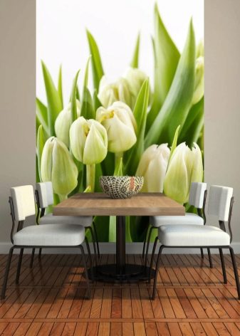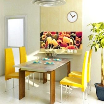 Platzieren in der Nähe des Tisches ist ein besonderer Akzent in jedem Kücheninterieur. Die beste Wahl sind realistische Bilder. Zum Beispiel, Blumen. Hell, lebendig, werden sie auf dem Tisch stehen. Oder ein offenes Fenster mit Blick auf die Stadt oder den Fluss. Eine andere Möglichkeit sind Früchte oder Gemüse, die auf dem Tisch "liegen". Aber dieser Effekt ist leicht mit Unachtsamkeit zu verderben, wenn Sie den Tisch mit verschiedenen Utensilien überladen.