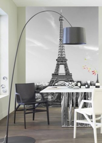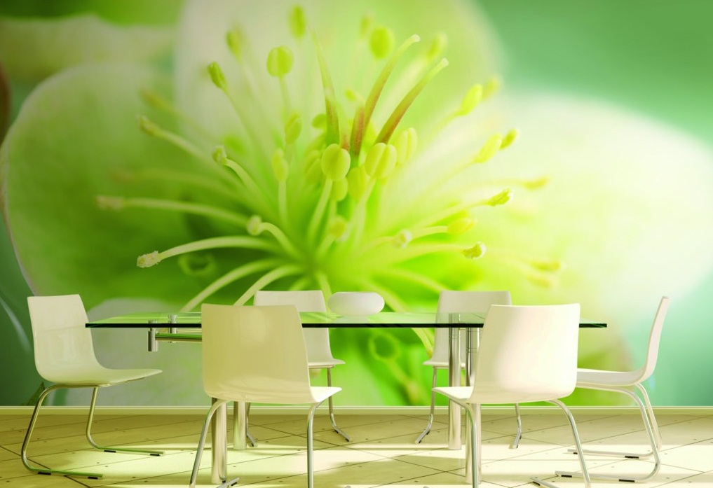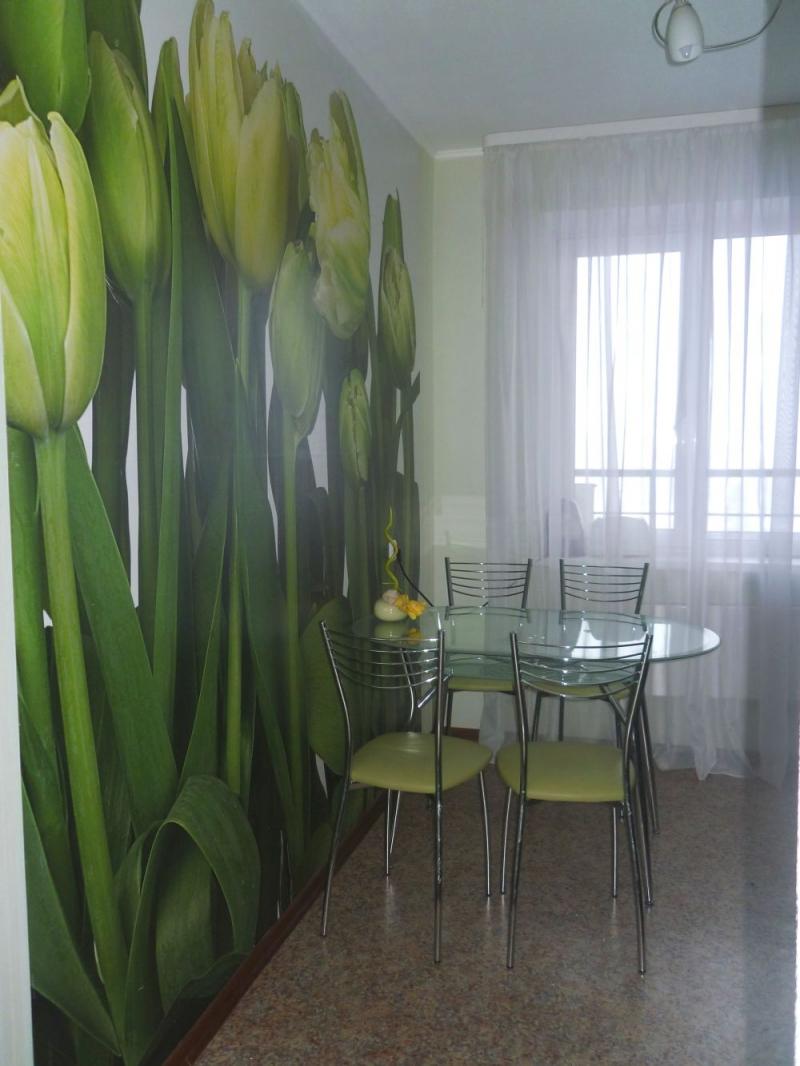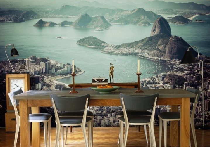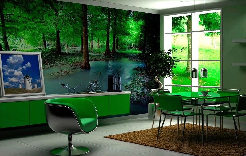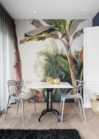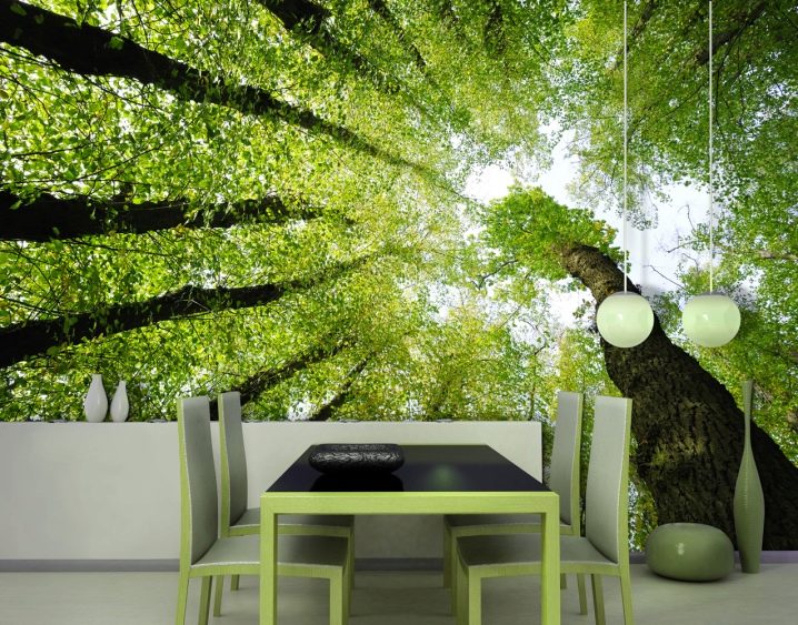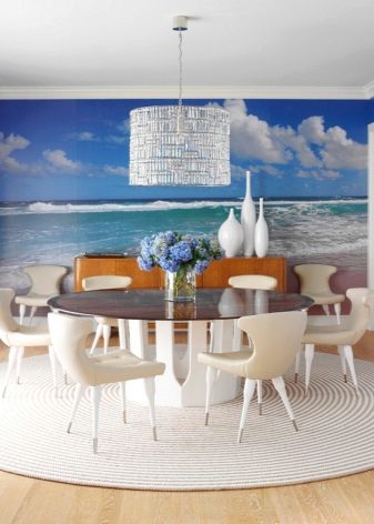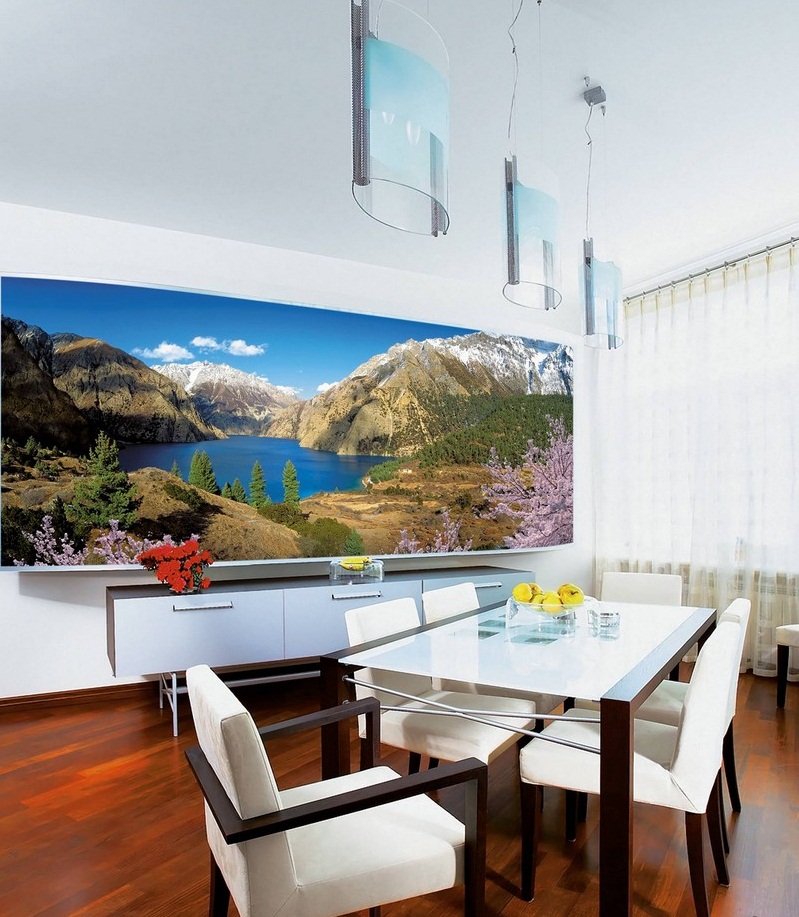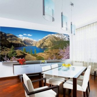 Eine ganze Wand kann mit einer Breitwand-Tapete abgedeckt werden, wenn sie völlig frei ist. Ein Teil des Bildes sollte nicht hinter einem Schrank oder Kühlschrank versteckt werden.