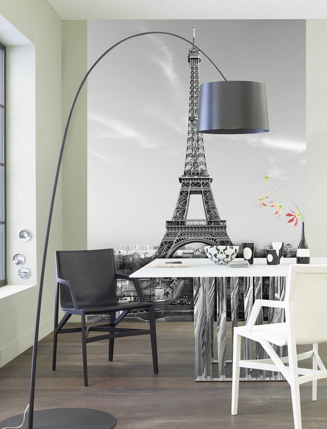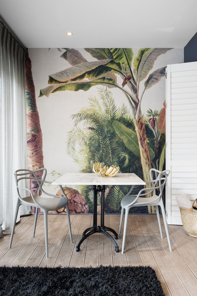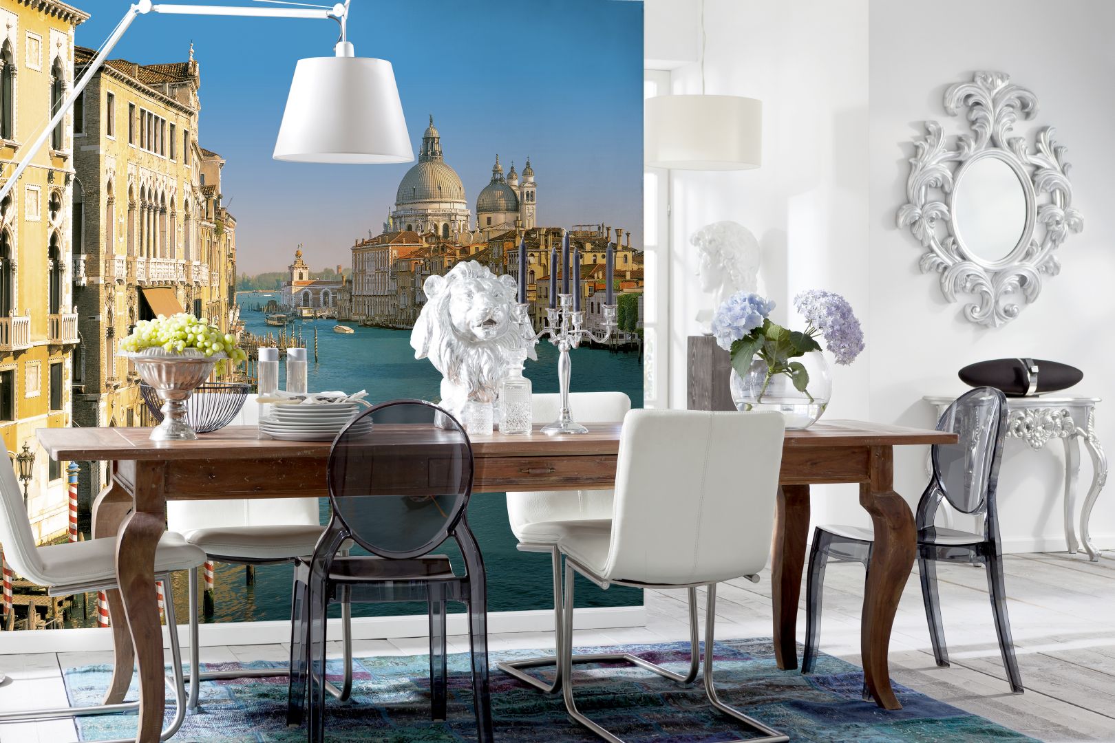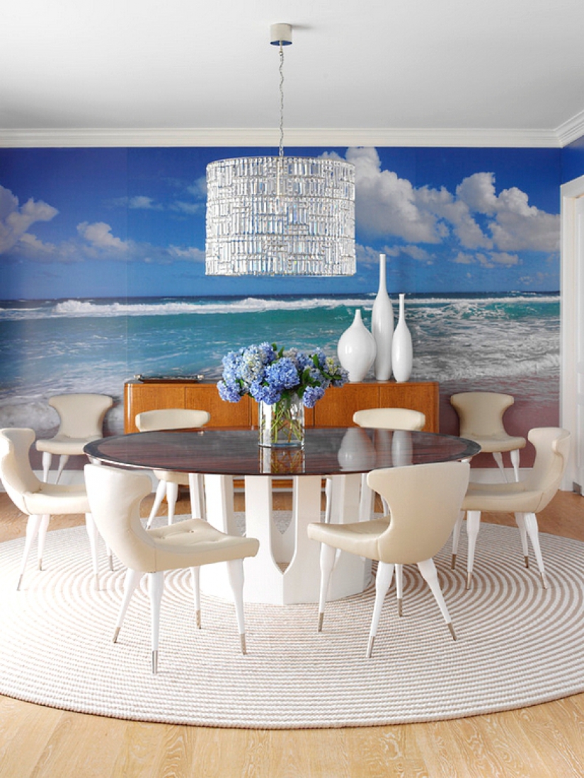Eine ganze Wand kann mit einer Breitwand-Tapete abgedeckt werden, wenn sie völlig frei ist. Ein Teil des Bildes sollte nicht hinter einem Schrank oder Kühlschrank versteckt werden.
