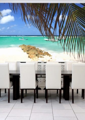 Eine Küche mit gedämpftem Licht, wo die Sonnenstrahlen nicht fallen oder dicke Äste der Bäume sich vor dem Fenster "verdunkeln", wird durch eine Fototapete gerettet. Sie sollten hell, positiv sein. Lass es Rasen sein, von Sonnenlicht durchflutet. Oder das Meer, der Strand und die Möwen.