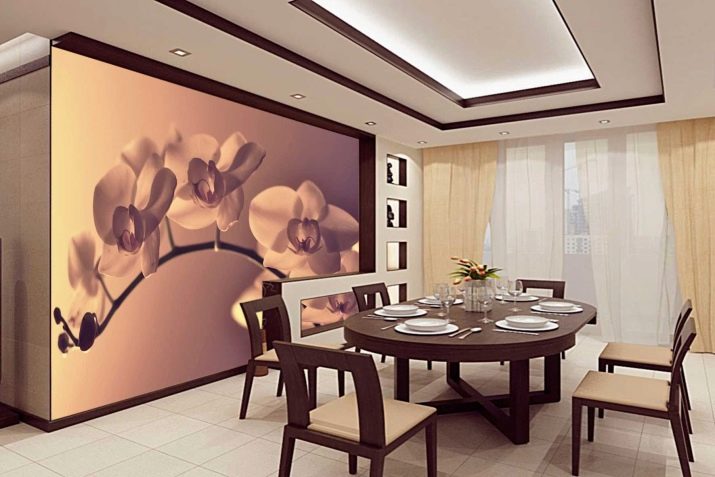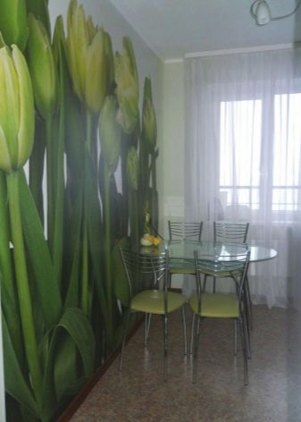 Es ist gut, bunte Möbel und Vorhänge mit ruhigen Fototapeten zu verdünnen. Und in der Küche eines blassen und eintönigen Stils wird es toll sein, ein lebendiges Bild wiederzubeleben. In der kleinen Küche ist es besser, blau, blau, lila und grün zu wählen. In einem dunklen Raum ist es besser warme und gemütliche Farben zu bevorzugen: Gelb, Orange, Pfirsich. Interessant wird aussehen und schwarz-weiß Fotos von Pflanzen, erschossen Nahaufnahme.