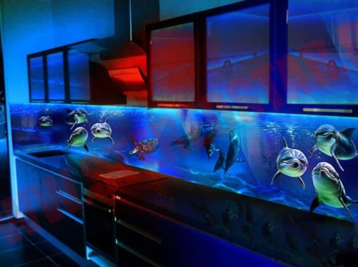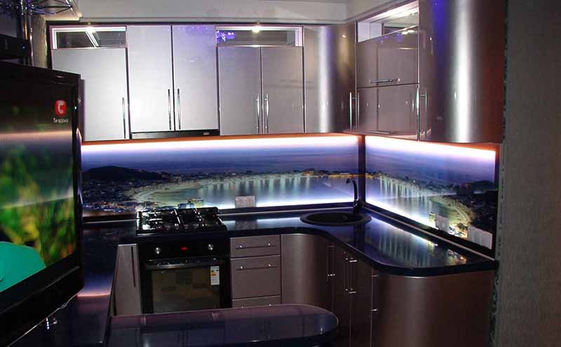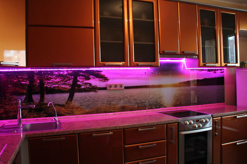 LED-Tapete in der Küche - ein ganzes System der Elektronik. Die mikroskopischen Lampen und eine Mikroschaltung sind in die Tapete integriert. Mit Hilfe der Fernbedienung und Änderung des Bildes, der Hintergrundbeleuchtung Helligkeit und Schattierungen. Sie können nur einen Teil des Bildes markieren, aber Sie können die gesamte Wand markieren.