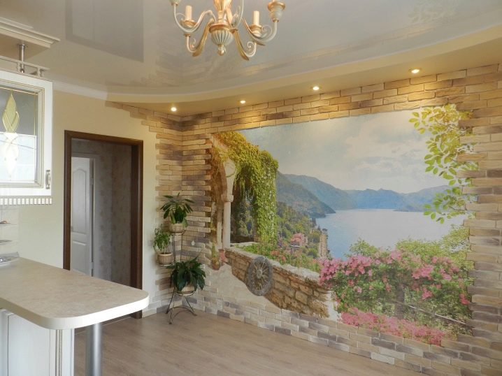 Tapeten in Form von Fresken verleihen der Küche einen Hauch von Luxus. Die Fresken schmücken die Adelshäuser, jetzt können Sie direkt in Ihrer Küche aussehen. Große Stillleben, antike Mosaike auf dem Fresko sehen reich aus. Das diversifiziert das bescheidene Innere der Küche, das alle Gäste zweifellos schätzen werden.