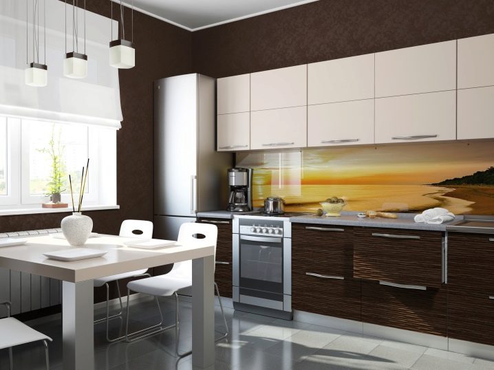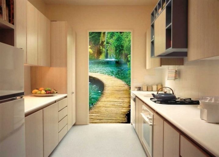 Die Küche in Form eines schmalen Rechtecks, Sie müssen einen "Horizont" erstellen. Zum Beispiel eine Ebene, die in die Ferne geht. Oder unbegrenzter Meeresraum. Eine weitere Option - ein Panorama der Stadt aus einer Höhe von Vogelflug.