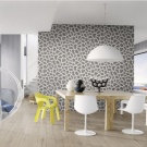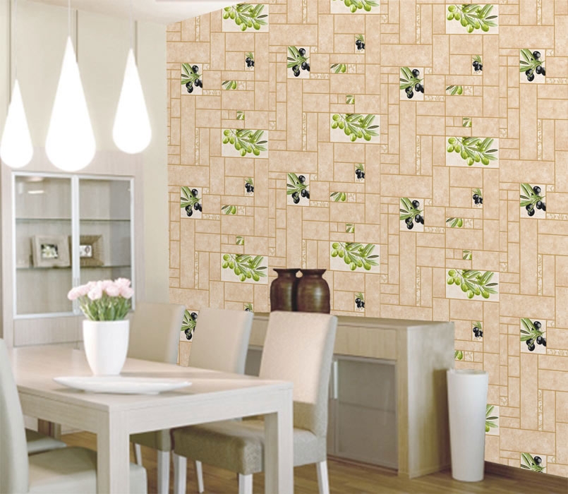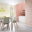 Waschbares Vinyl auf Papierbasis ist eine Rolle von 0,53 m Breite.Dieses Material ist leicht zerknittert, kommt aber schnell in seinen ursprünglichen Zustand. Erhalten Sie es auf der Grundlage von schäumendem PVC, dann wird die Prägung mit speziellen Inhibitoren fixiert. Als Zeichnungen werden sie meistens auf Obst und Küchenutensilien, Kaffee und andere Stillleben angewendet. Häufige moderne Vinyltapete mit geometrischen Mustern in Form von Formen und Streifen, abstrakte Landschaften.