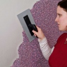 Das Auftragen des Materials ist ähnlich dem Auftragen von Kitt. Wir sammeln Lösung mit einem kleinen Spatel. Jetzt reiben Sie die Mischung einfach an der Wand. Schichten sollten ungefähr 2-3 mm sein.Um nicht zu täuschen - lesen Sie die Anweisungen. Einige Arten von Tapeten werden in einer dickeren oder dünneren Schicht aufgetragen. Zum Kleben der Tapete benötigen Sie kleine Absätze.
