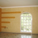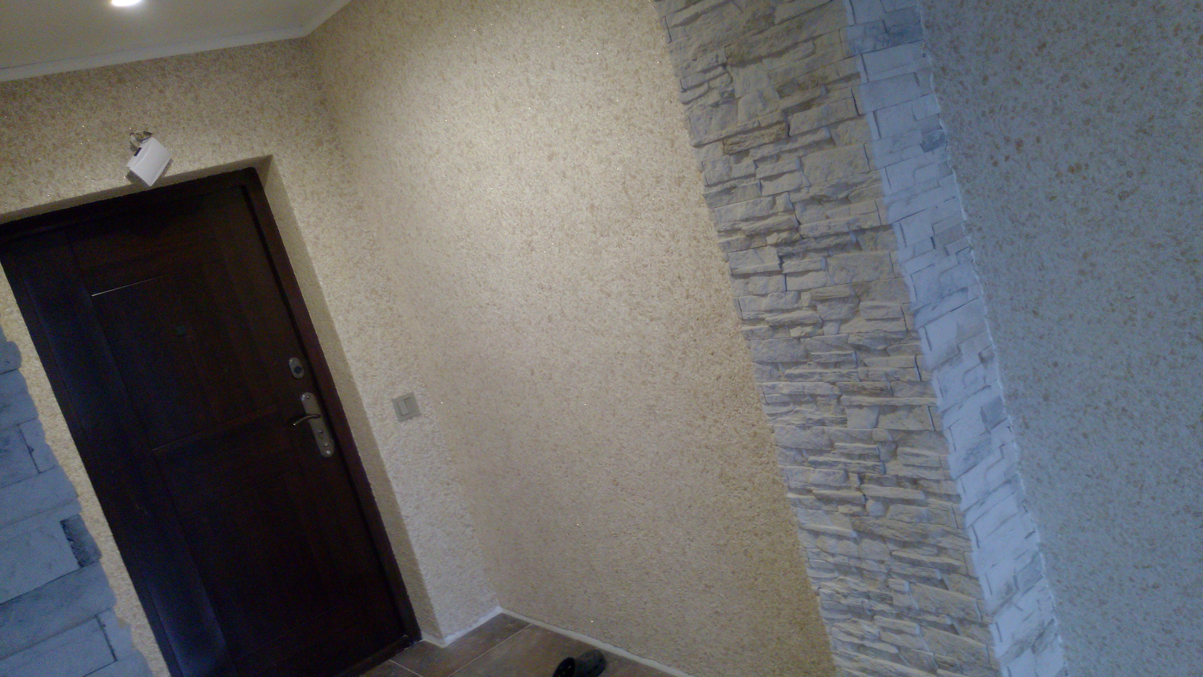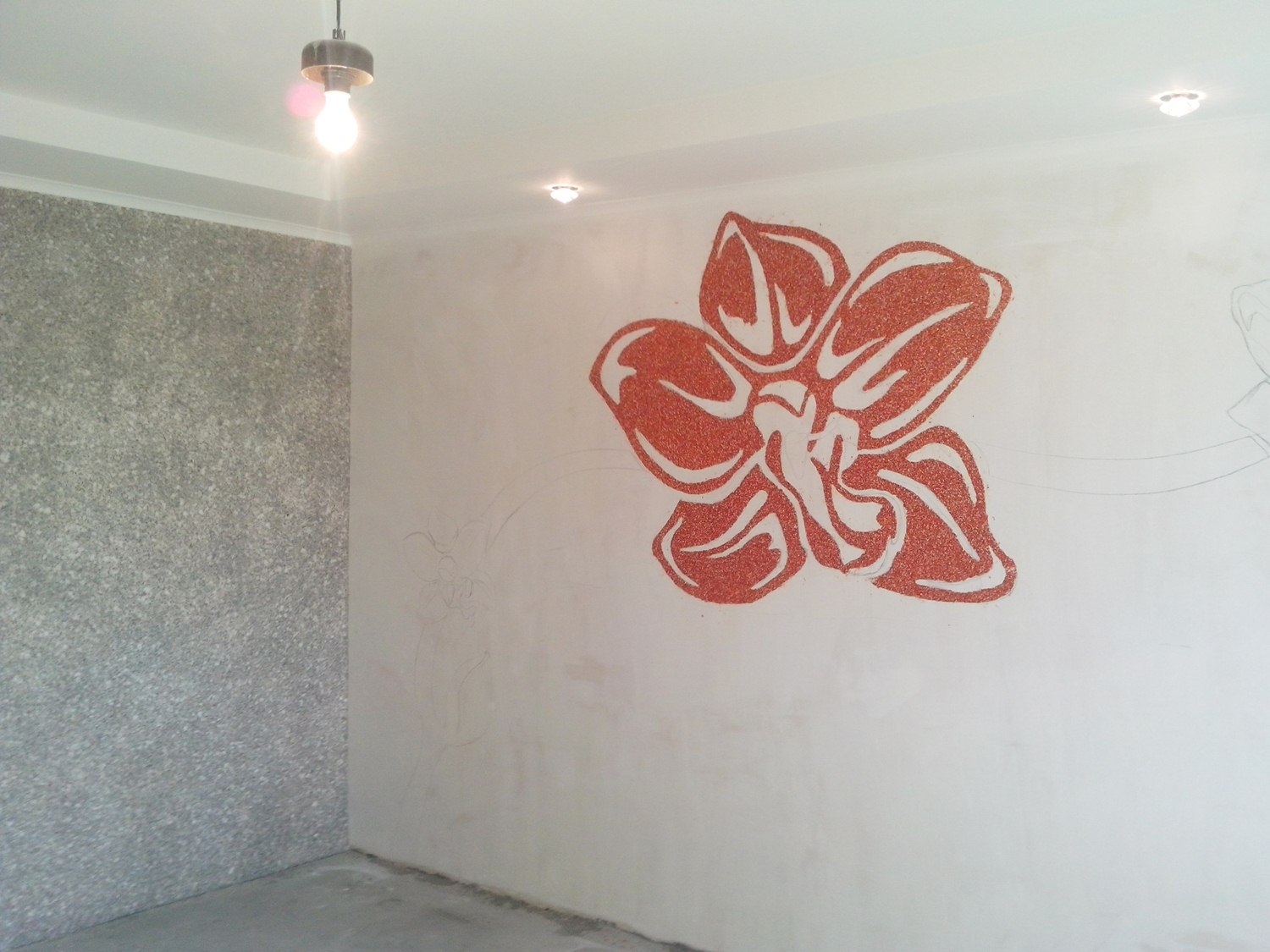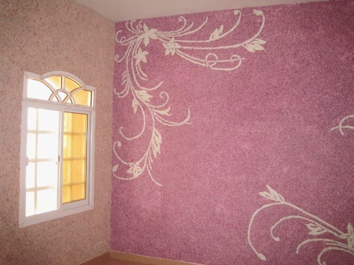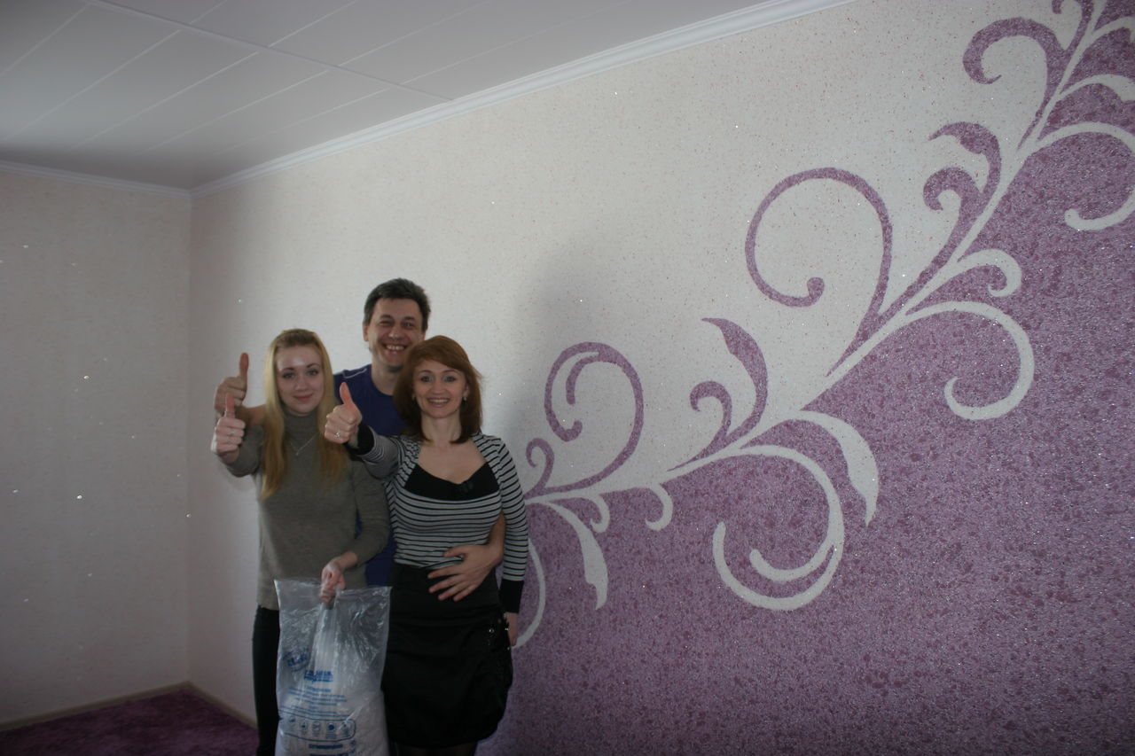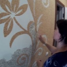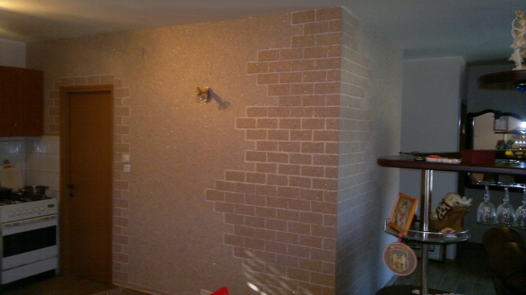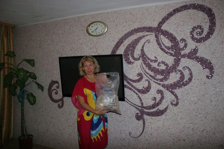 - Anders als bei herkömmlichen Tapeten erfordert die Verwendung von flüssigen Analoga keine Hilfe von außen. Darüber hinaus spart die Verwendung dieser Zusammensetzung signifikant Zeit beim Dekorieren von Wänden.