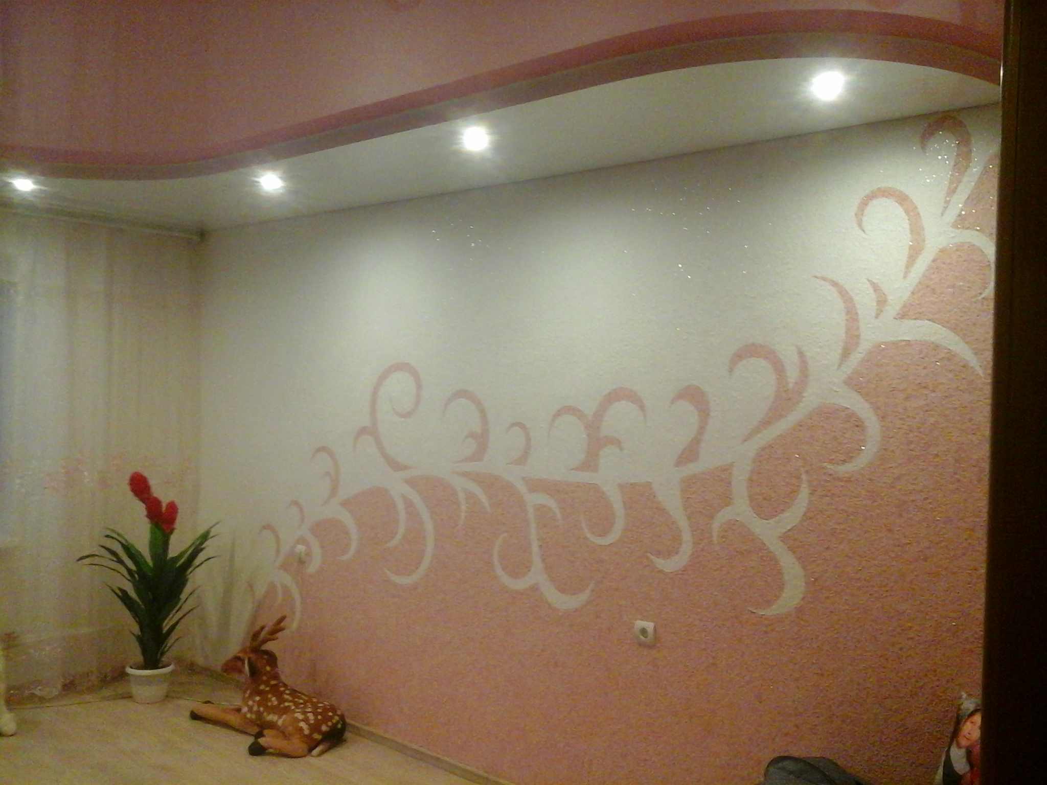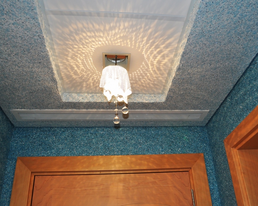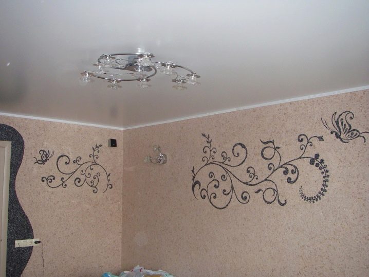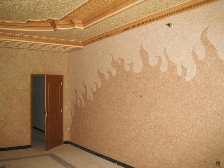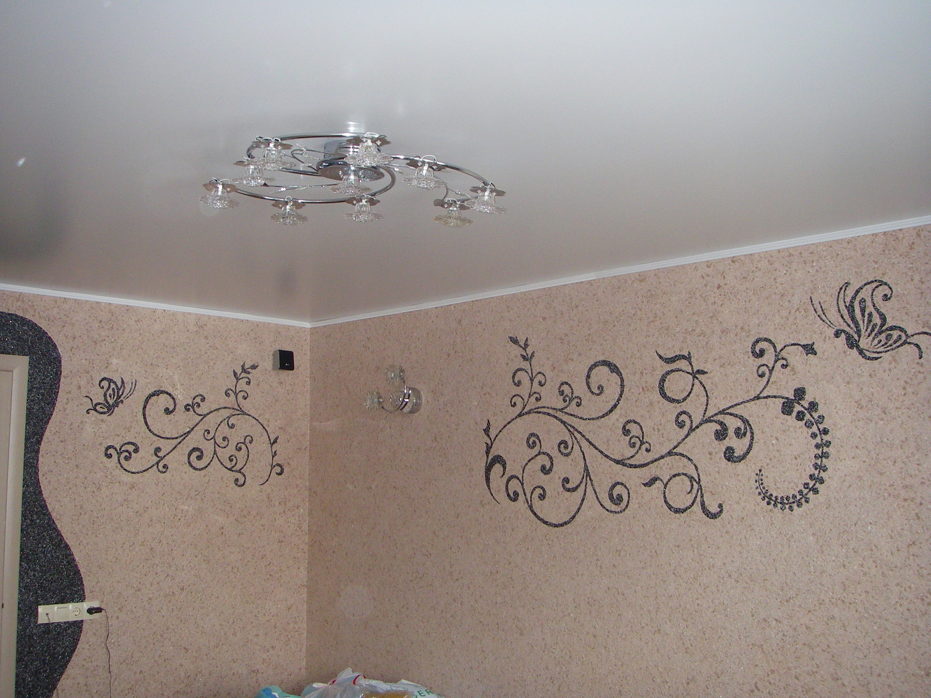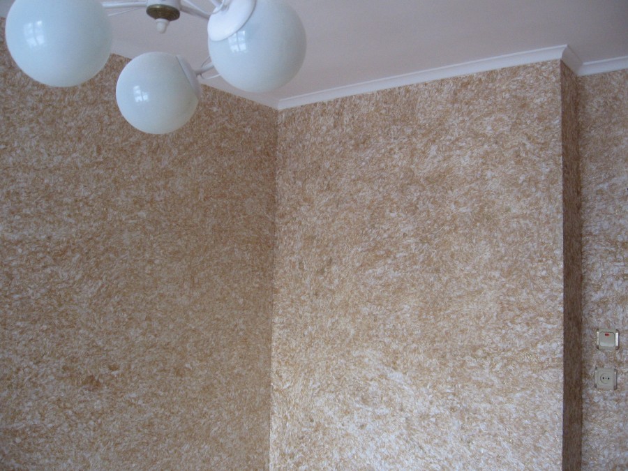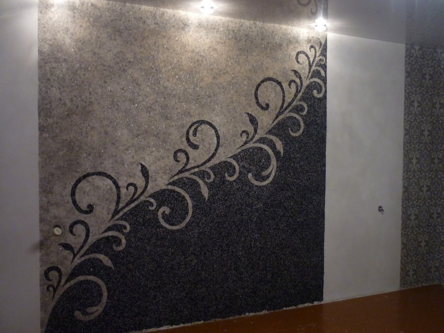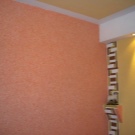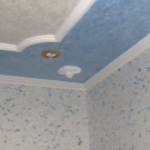 - Bewerben flüssige Tapeten können an den Wänden und Decken sein. Dieses Material ergibt eine vollkommen glatte Oberfläche ohne Nähte. Bei herkömmlichen Tapeten ist eine solche Perfektion unerreichbar.