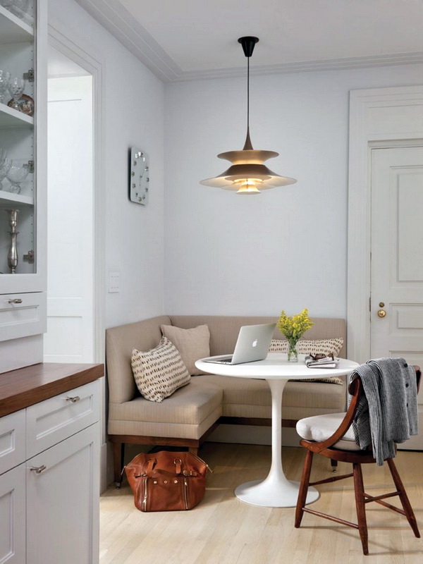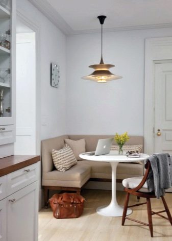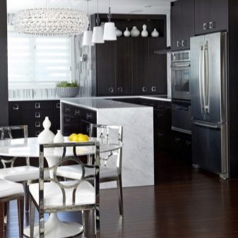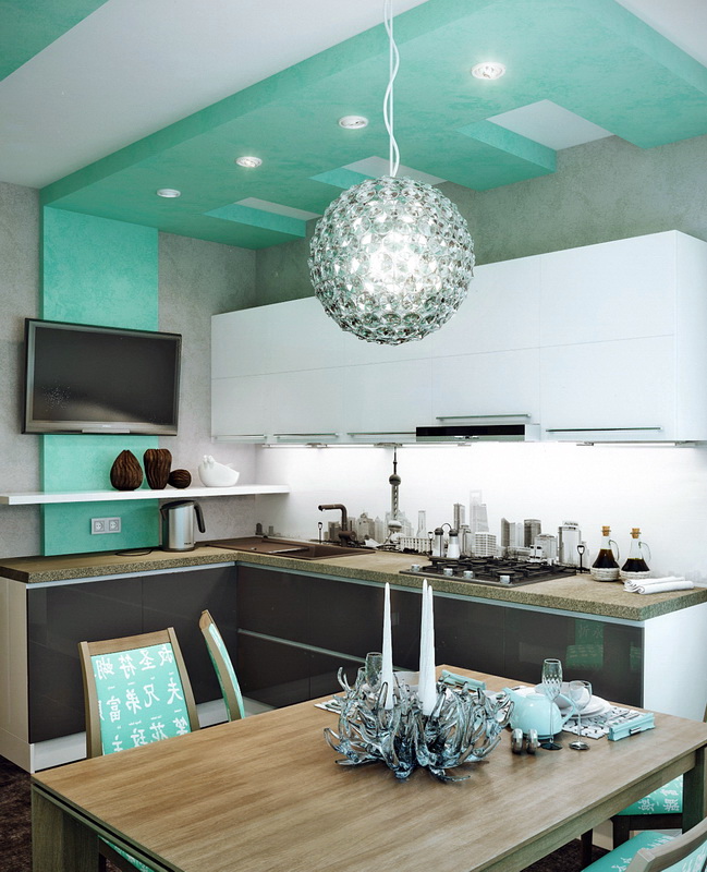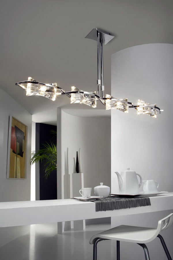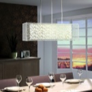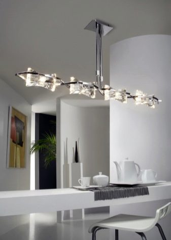 Aber was ist mit dem Fall der meisten Standard-Apartment-Küche von 8 qm? In der Tat ist alles so einfach wie bei einer großen Küche, hier gelten genau die gleichen Regeln und Trends. Allerdings sollten Sie keine sehr sperrigen Kronleuchter mit einer großen Anzahl von Lampen wählen, denn in einer solchen Küche brauchen Sie nicht zu viel Licht. Außerdem. Ein zu großer Kronleuchter reduziert optisch den ohnehin kleinen Platz, macht ihn unverhältnismäßig und gibt der Küche ein Gefühl von geschmackloser Umständlichkeit.