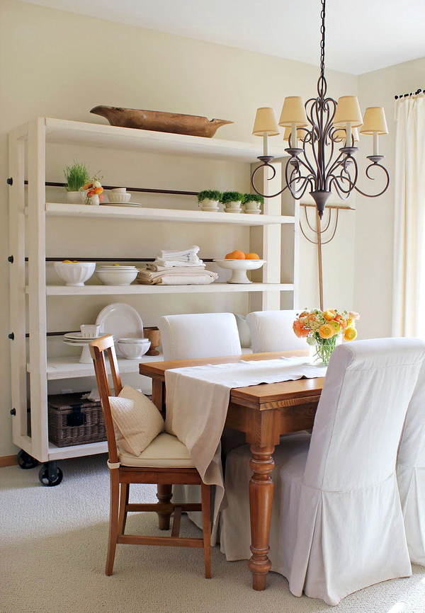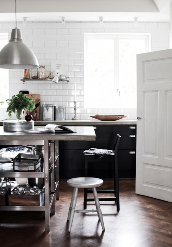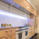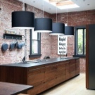 - Zur Ausleuchtung des Arbeitsbereiches sind Punkt- oder Hängeleuchten ideal. Meistens befinden sich Regale mit Küchenutensilien und Lebensmitteln über dem Arbeitsbereich. In diesem Fall ist es sehr praktisch, die Hintergrundbeleuchtung unter das Regal zu stellen oder Regale mit eingebauter Beleuchtung auszuwählen. Ein zusätzlicher Vorteil dieser Art von Beleuchtung ist, dass das Licht den Händen und nicht dem Rücken reicht. Wenn die Abmessungen der Küche es erlauben, einen Arbeitsbereich in seiner Mitte zu platzieren, ist es logisch, eine Hängelampe mit hellem Licht zu wählen, die an der Decke der Küche angebracht ist.