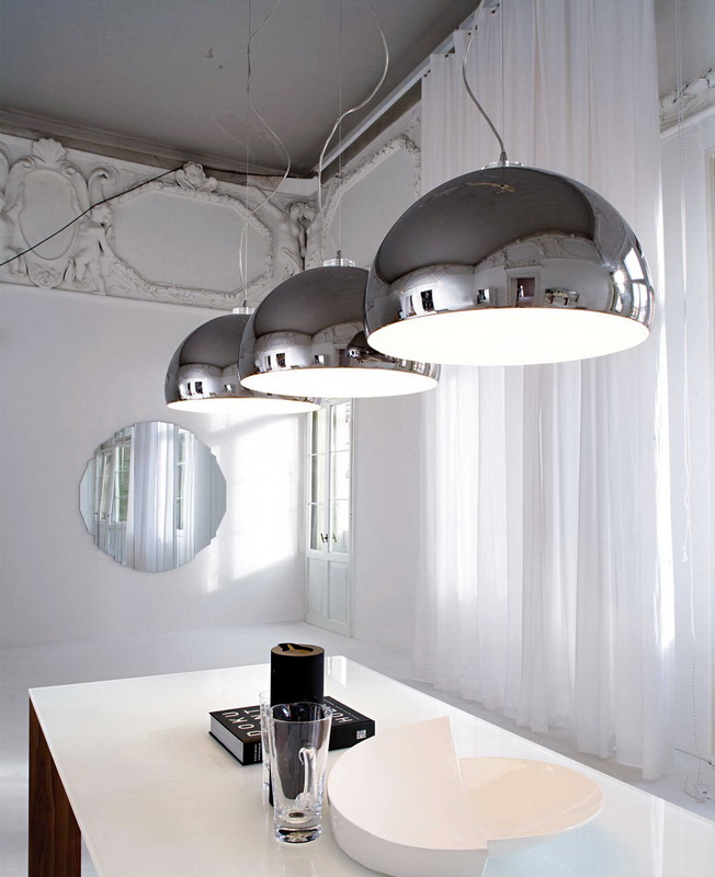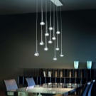 Das zentrale Beleuchtungselement kann ziemlich massiv sein: In diesem Fall passen perfekt passende Kronleuchter in Form einer Kugel oder einer Kuppel oder ein großer, komplizierter Kronleuchter. Sehr relevant werden Versionen von hängenden Kronleuchtern aussehen, die durch eine einzelne Basis vereint werden, es können Kronleuchter sein - Glocken oder ihre modernen Variationen, mehr wie umgekehrte Gläser.