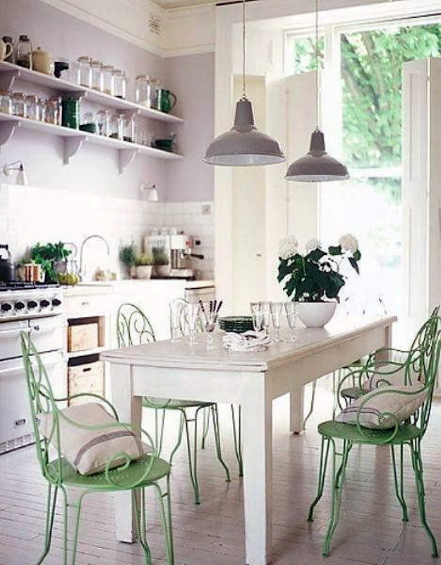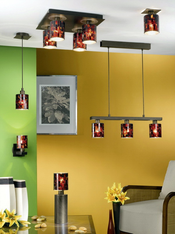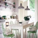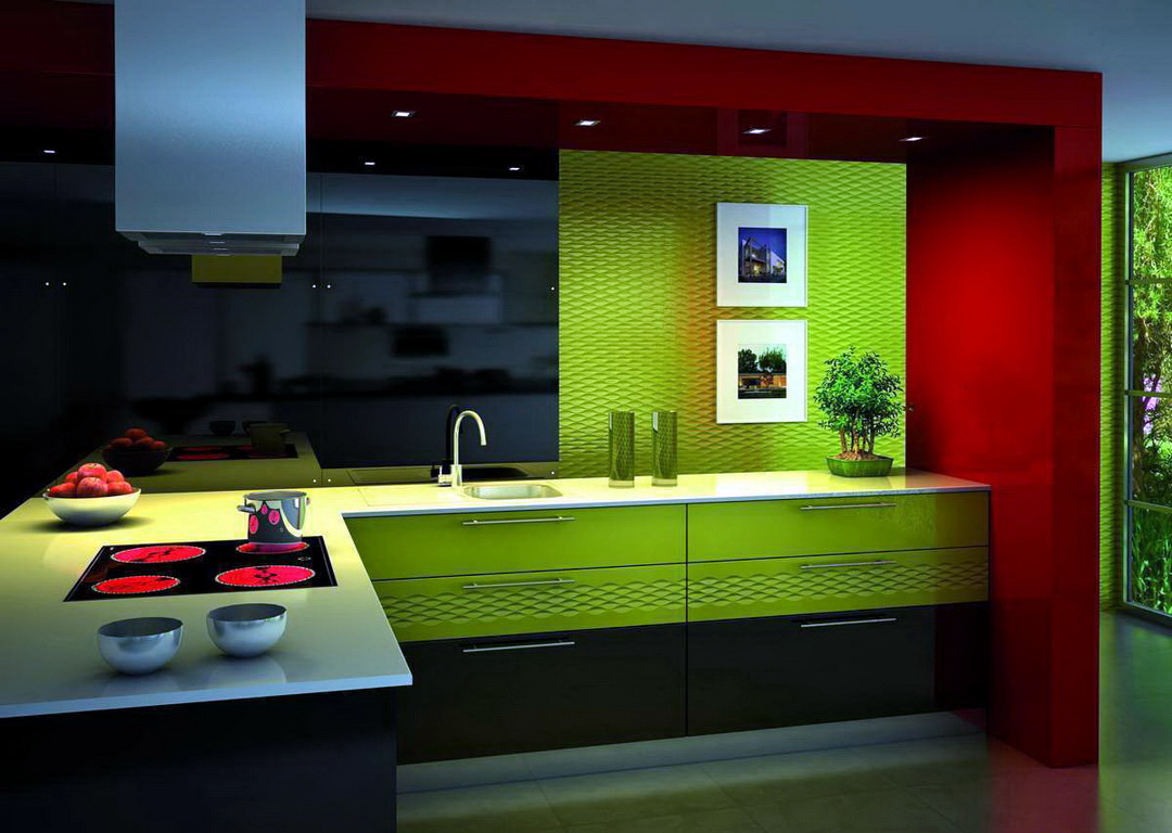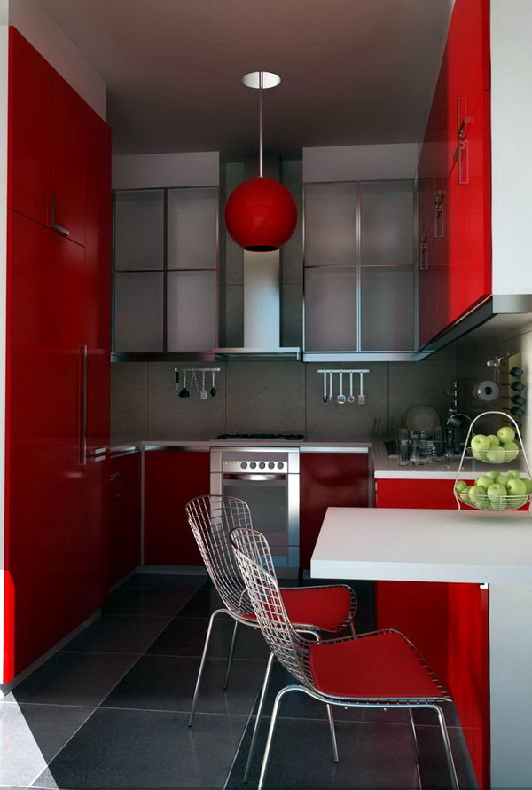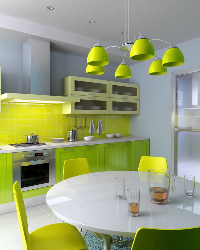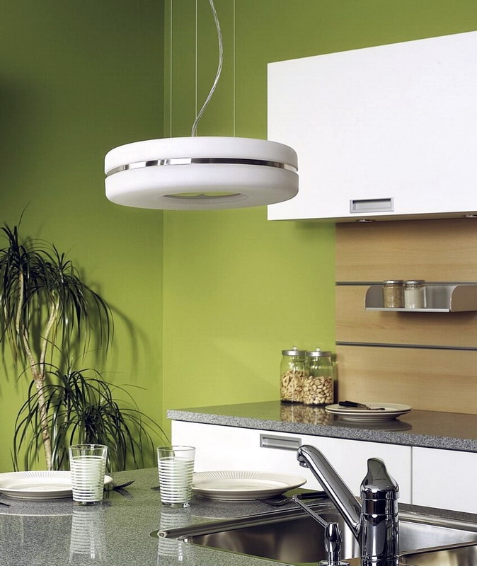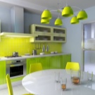 Heute sind helle, glänzende Beschichtungen von Küchenmöbeln sehr gefragt.Diese Lösung ist typisch für moderne Küchen. In der Regel empfiehlt es sich, für solche Möbel ein prägnantes, dezentes Beleuchtungsdekor zu wählen, aber in einer solchen Situation ist auch Kontrast angebracht. So werden zum Beispiel saftige rote Lampen in einer hellgrünen Küche sehr kühn und originell aussehen oder umgekehrt: grün auf rot. Wenn Sie Ihre Entscheidung für eine solche Entscheidung nicht treffen, müssen Sie sich daran erinnern, dass ein kontrastierender Punkt nicht ausreicht. Daher ist es angemessen, Stühle oder Textilien zu betrachten, die auf den Farbton der Lampe abgestimmt sind.