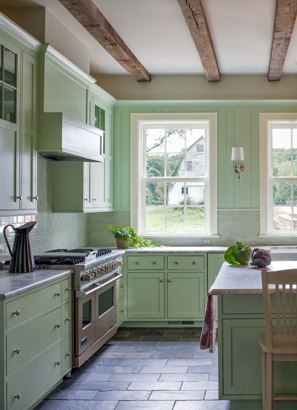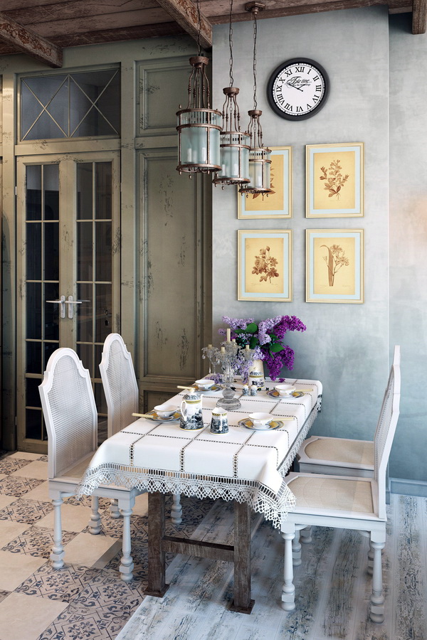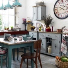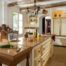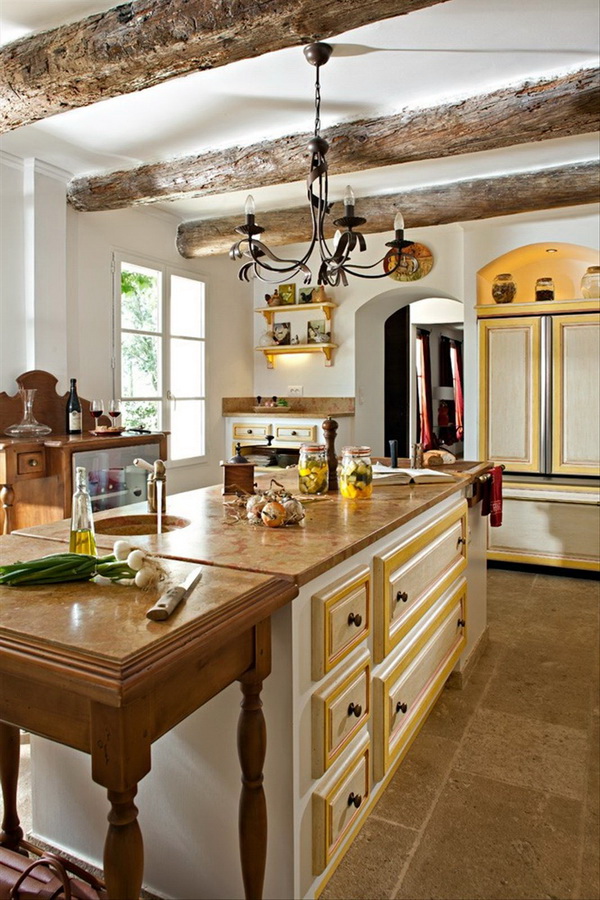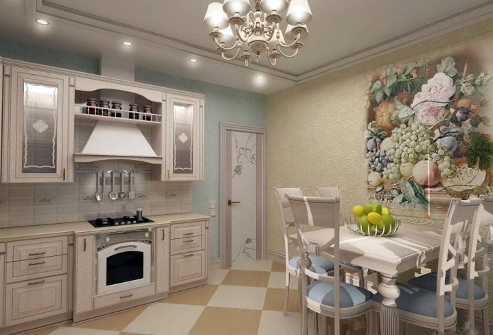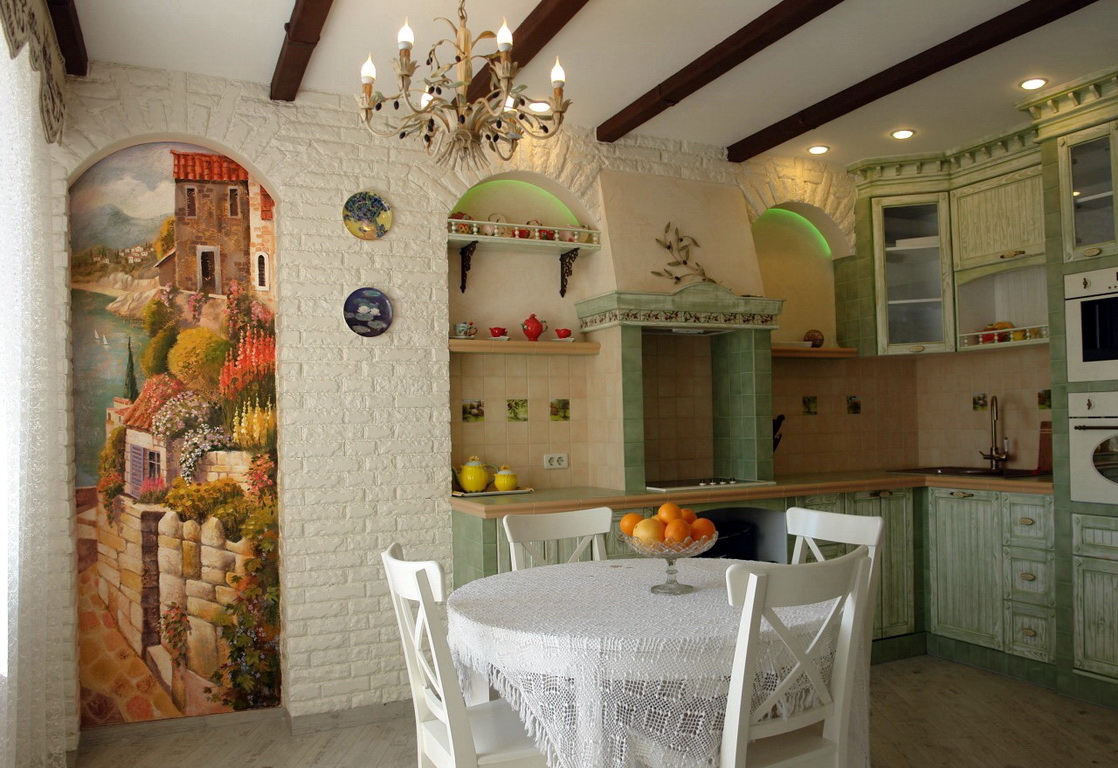 Der Provence-Stil zeichnet sich durch zarte Pastelltöne, eine Fülle von Blumen, Strickwaren und Licht aus. Die ideale Küche in diesem Stil ist die Küche mit großen Fenstern, Vorhänge mit feinen Vorhängen mit einem kleinen Blumendruck. Mit Hilfe moderner Beleuchtungstechnik können Sie selbst in der gewöhnlichen Wohnung ein solch ungewöhnliches Design schaffen. Es ist genug, nur über Ihre zukünftige Küche nachzudenken: moderne Haushaltsgeräte sollten organisch mit dem klassischen Design von Möbeln kombiniert werden, können Sie die Wand mit einer Landschaft oder einem Gemälde mit Blick auf provenzalische Wiesen sicher dekorieren. Natürlich lohnt es sich, Textilien besondere Aufmerksamkeit zu schenken. Bei diesem Entwurf werden auch dekorative Balken an der Küchendecke nützlich sein. Floristik nimmt einen wichtigen Platz ein - frische Blumen sollten immer in einer solchen Küche sein.